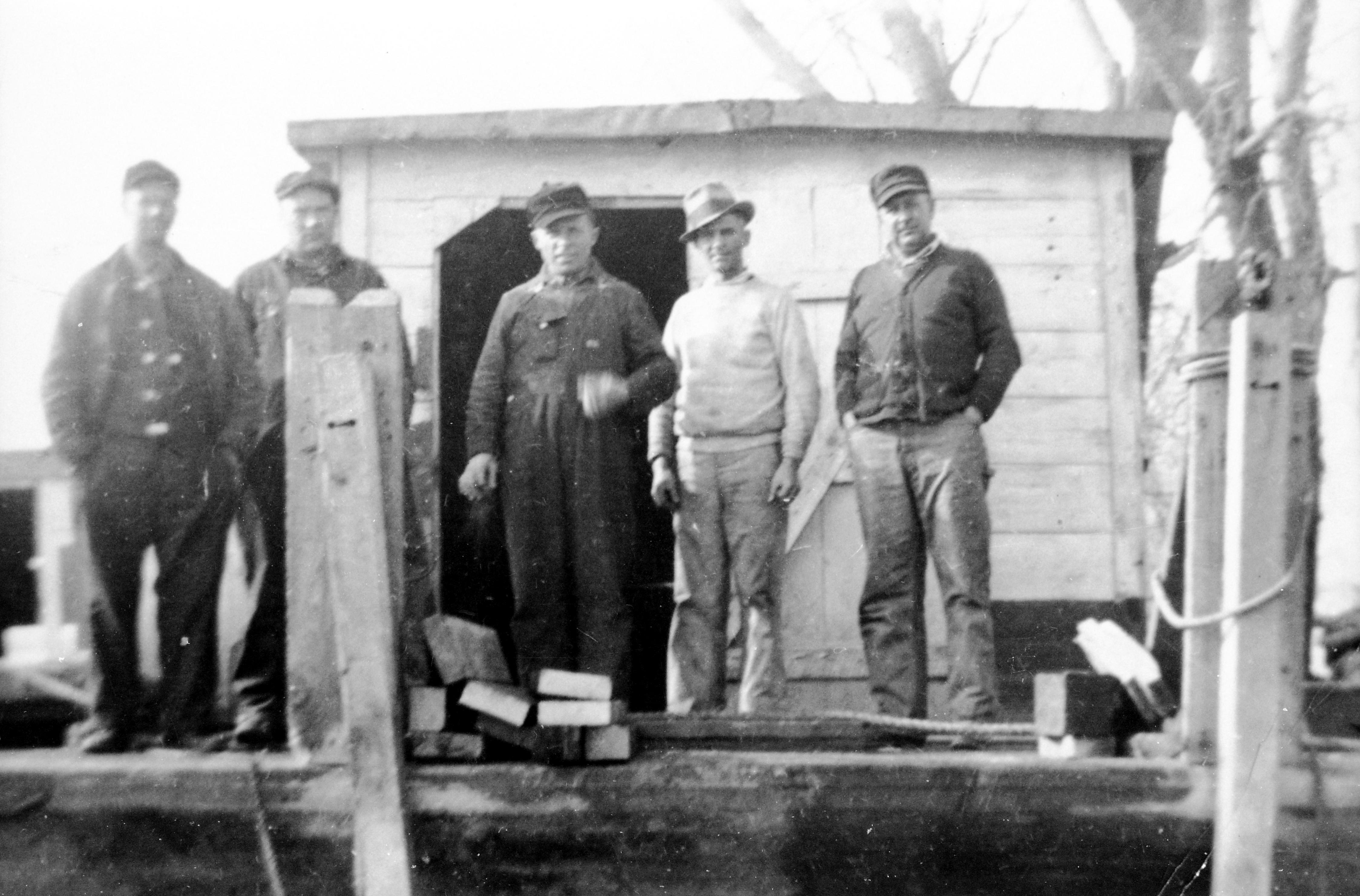 Dam 49 workers, left to right, Nelson Burlison (Nellie Hape's father), Mr. Ford, Roy Hape (Nellie's husband), Gene Austin, Mr. Cook. They might be on a maneuver boat.