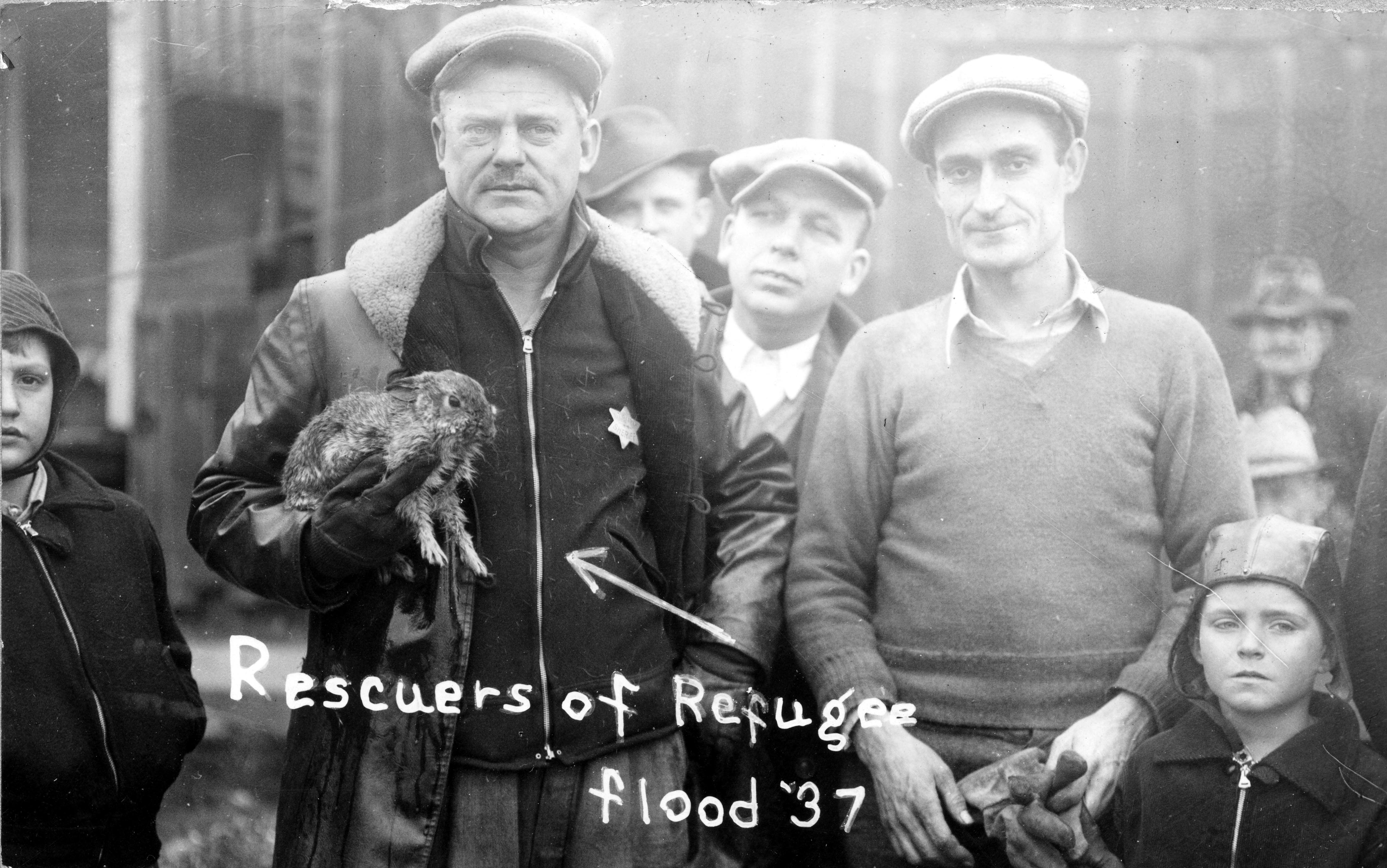 Six men and two boys, rescuers of refugee rabbit. Wet rabbit held by man wearing Deputy Sheriff badge.