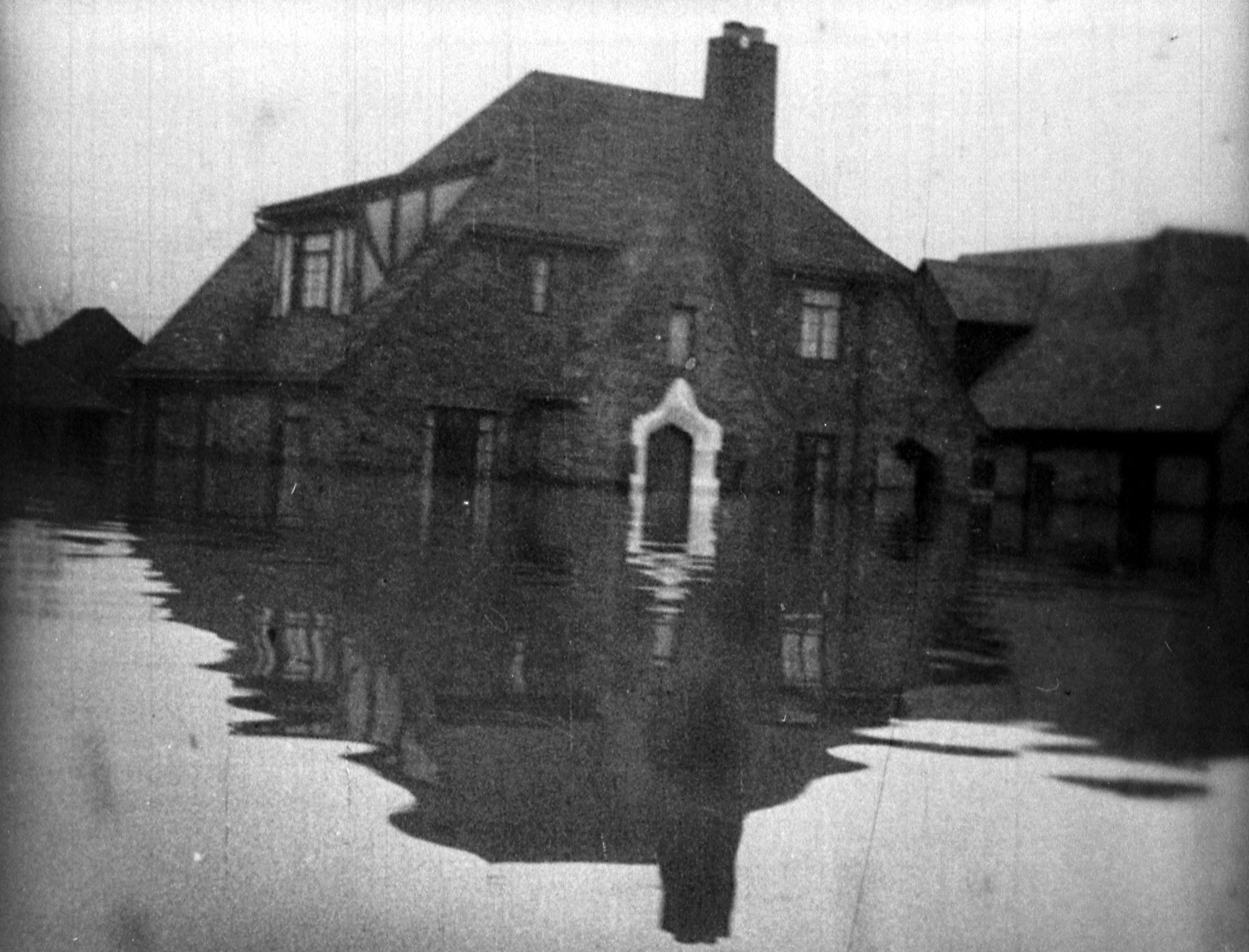 Brookside Dr., with man holding oar near flooded house. House only one week old, man lived in house only three days, so upset had to be taken away.