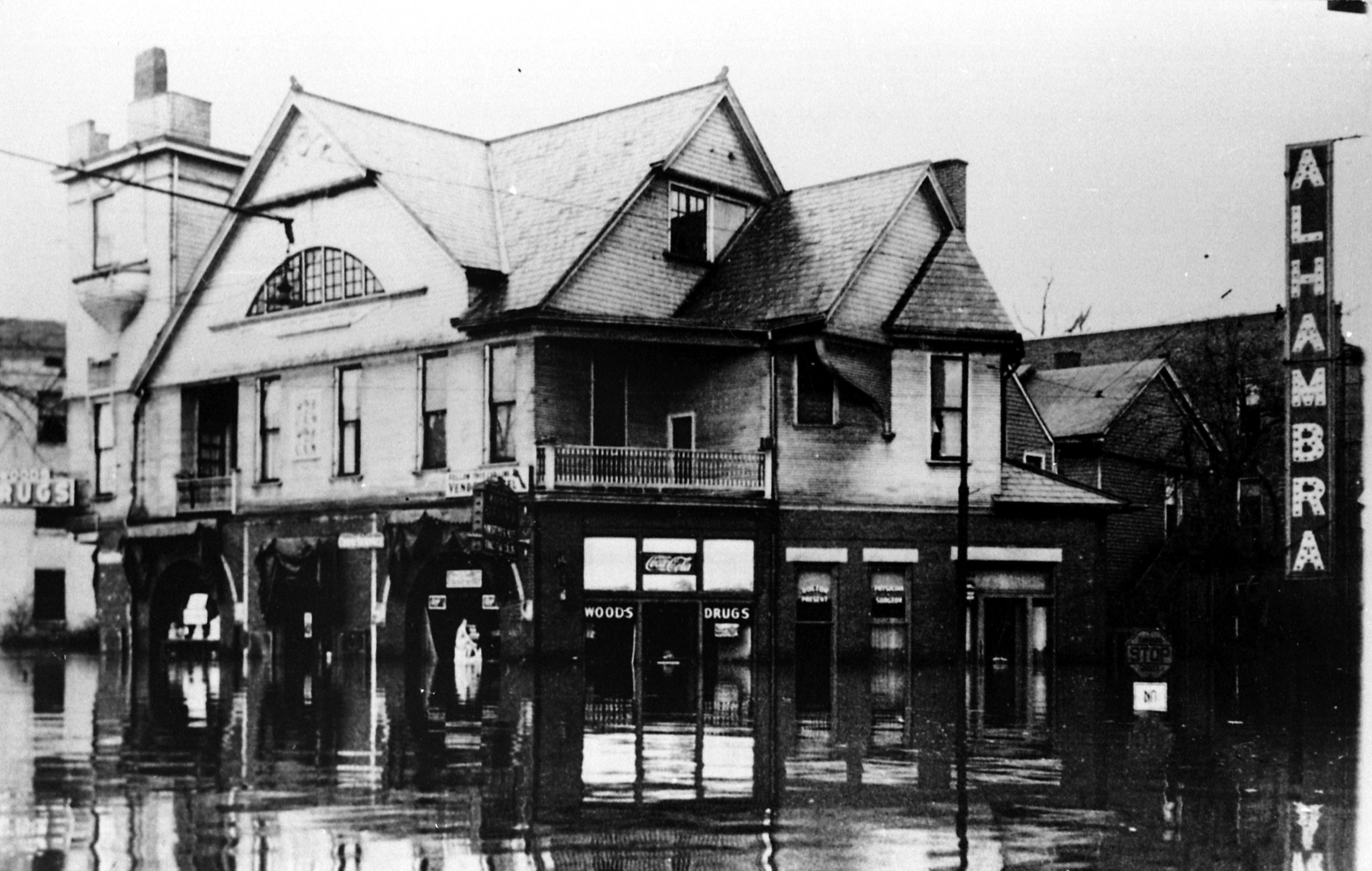 Haynie's Corner area (current name) of Evansville, IN near 1st block of Washington Ave. bounded by 2nd, Parrett, and Adams. Woods Drugs at 1022 S.E. 2nd St. is major building in photo, with sign for Alhambra Theatre, 52 Adams Ave., on right.