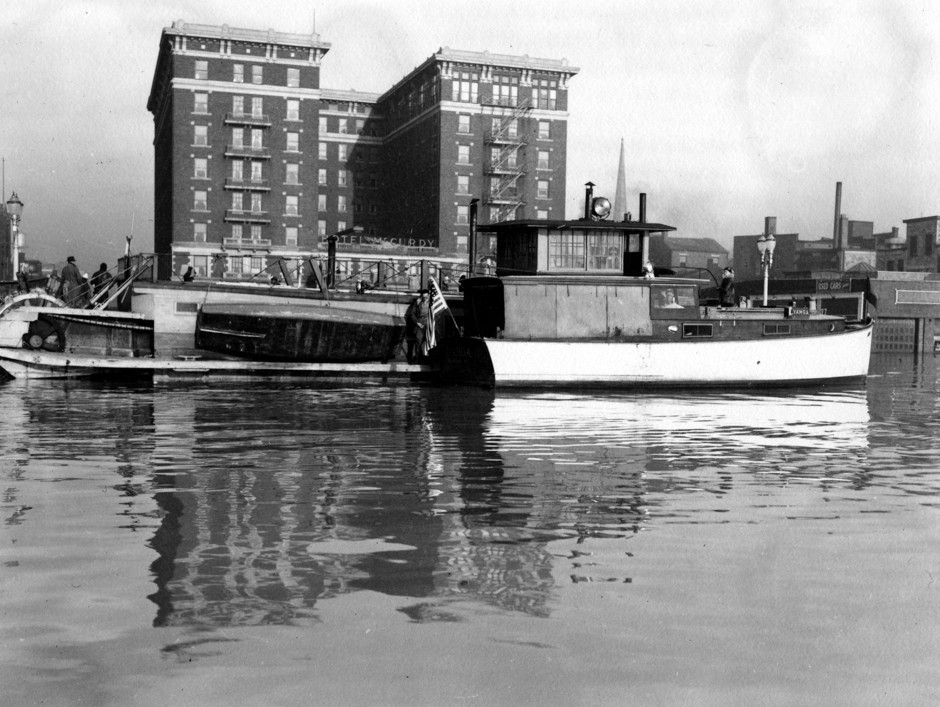 Paddle wheeler and other boat on river in front of the Hotel McCurdy at 101-11 SE 1st St.