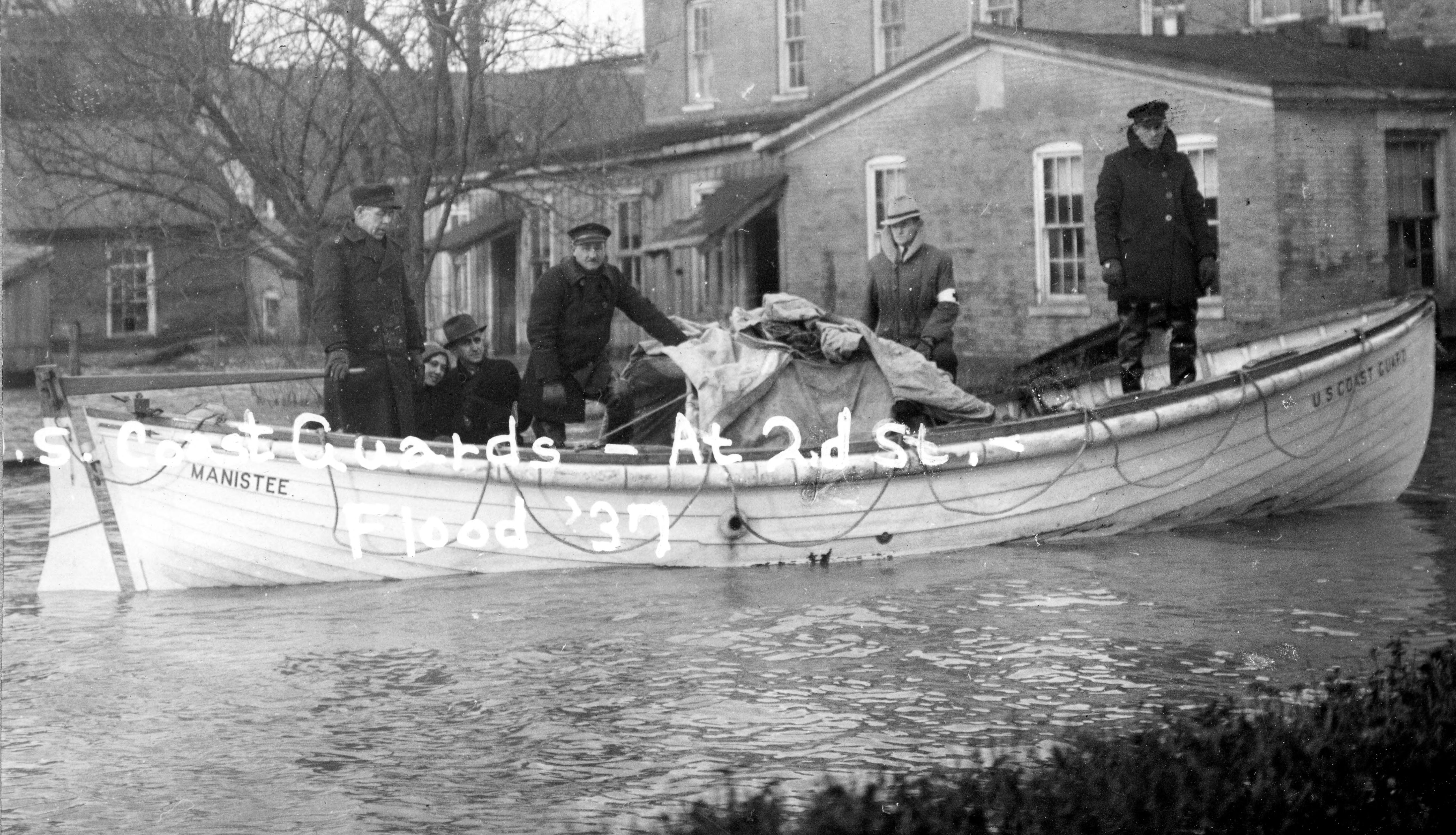 U.S. Coast Guard boat, the Manistee, with 3 Coast Guardsmen, an American Red Cross worker, and 2 others (man and woman), with something piled in middle of boat. Houses are immediately behind the boat, so this might have been a rescue or evacuation.