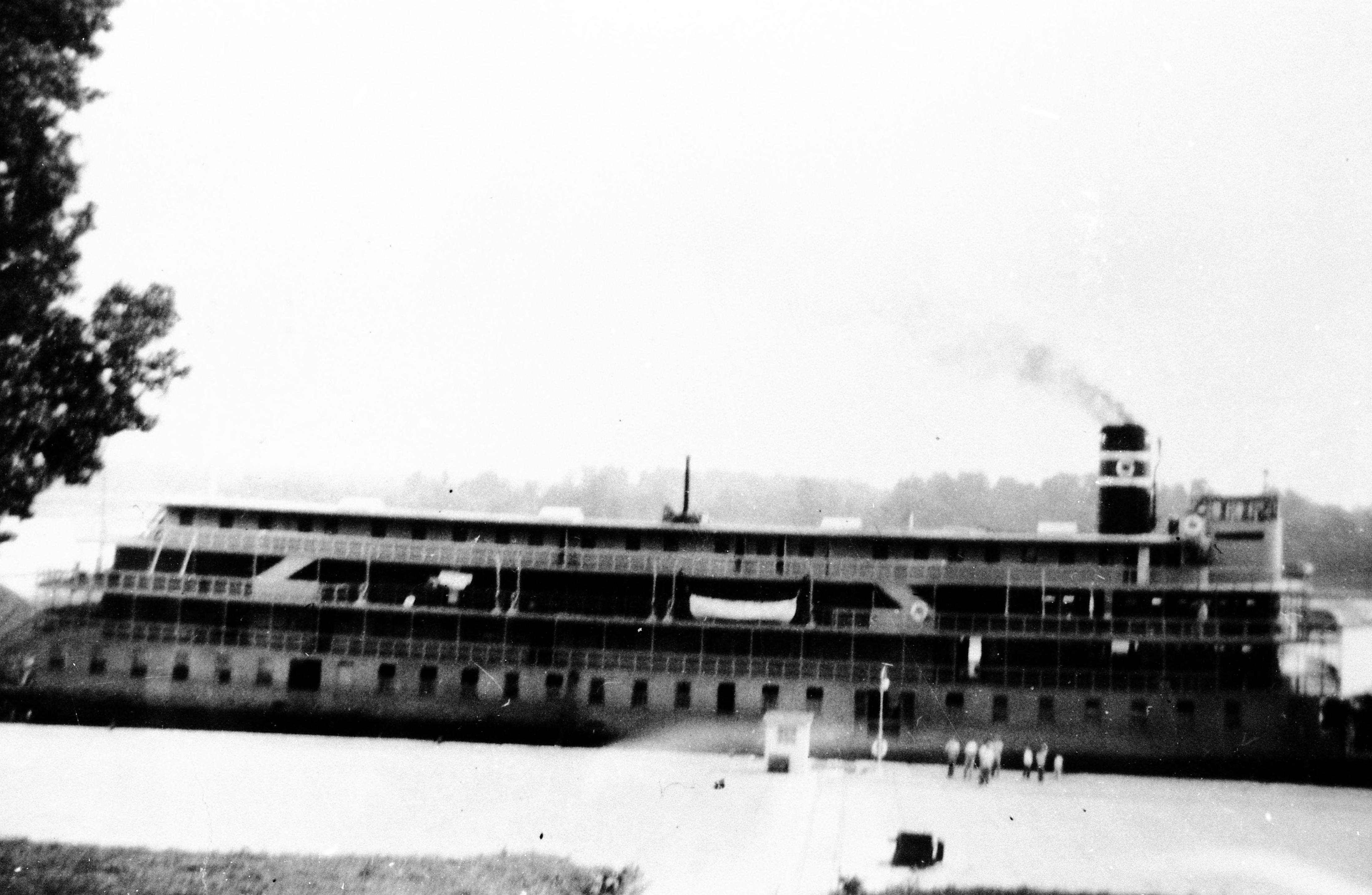 Paddle wheeler the Island Queen, docked at Uniontown, KY, with people standing on dock. (Many Posey County proms were held here.)