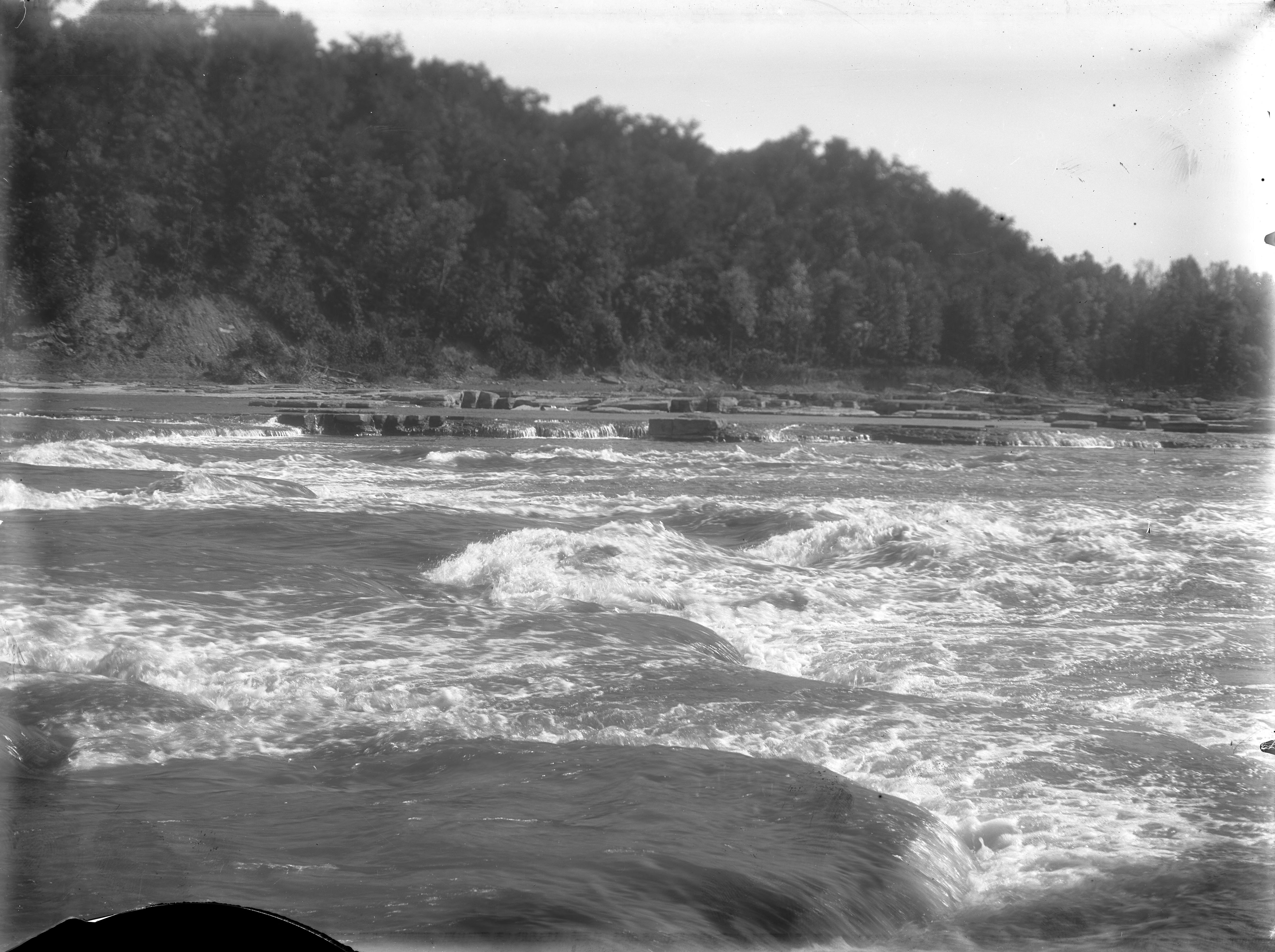 Old dam showing rough water---""The Old Dam is a group of natural rock formations rising from the bed of the Wabash River near New Harmony. When the Wabash is low in Summer, the rocks emerge forming a series of rapids, pools, and waterfalls." (http://visitposeycounty.com/the-old-dam/).