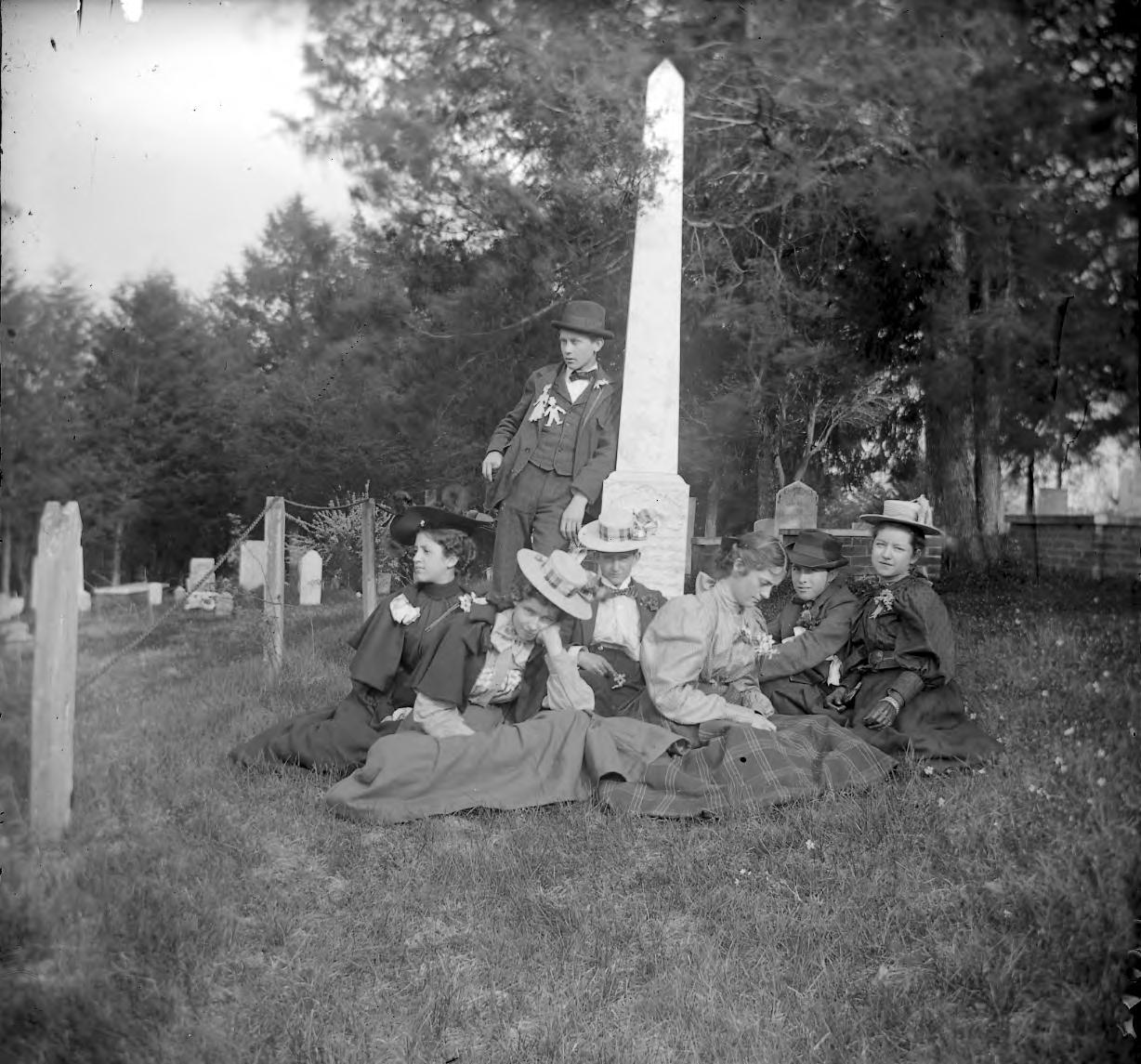 Nellie Hargraves (far left) and 4 female friends and 2 male lounge around Rudd Viets' (died 1879 at age 68) grave marker in Maple Hill Cemetery.