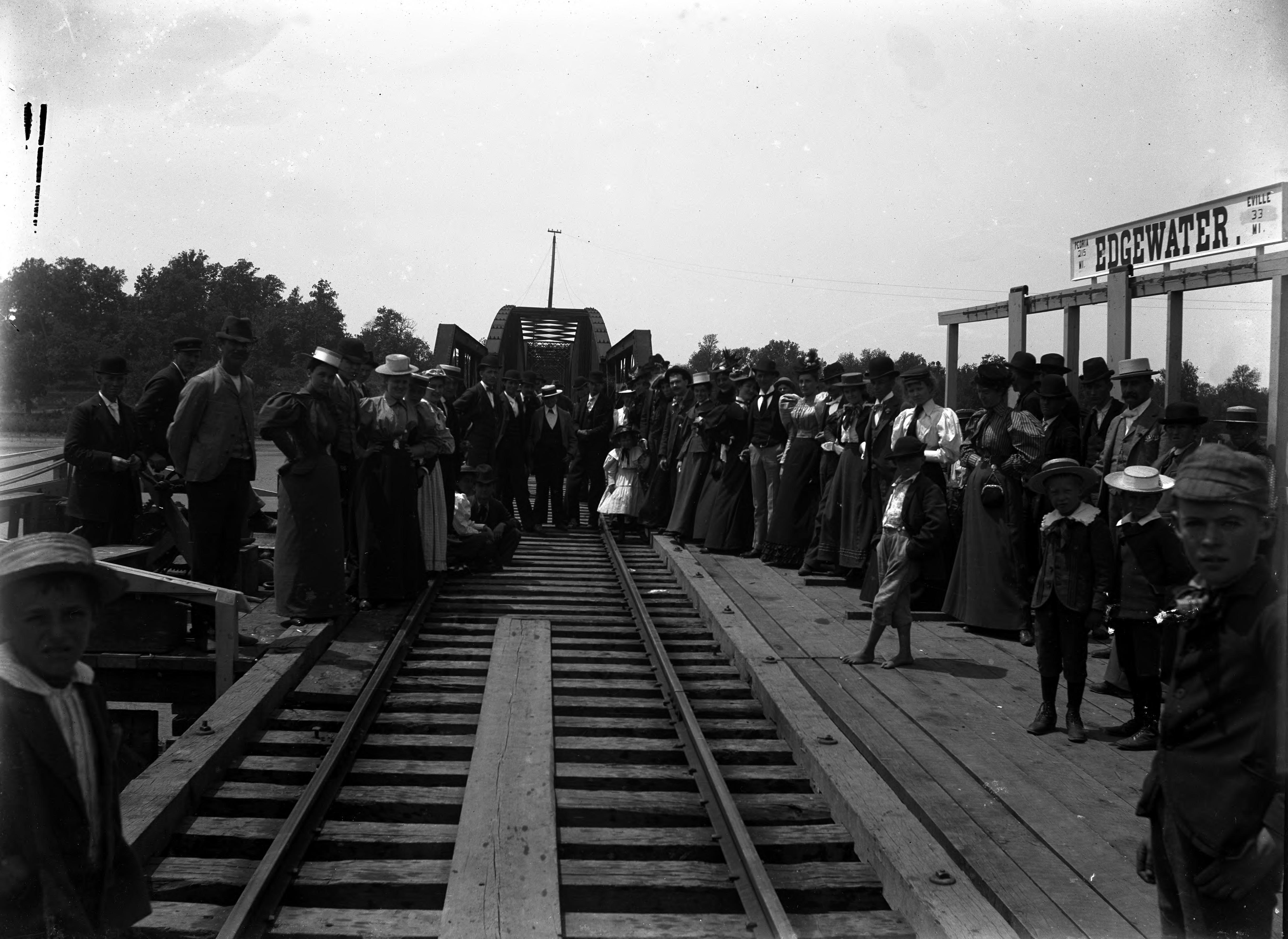 Edgewater railroad station, with people around and on the tracks. The bridge crossing the Wabash River to Illinois is in the background. The Edgewater sign notes that it is 215 miles to Peoria, IL and 33 to Evansville, IN.