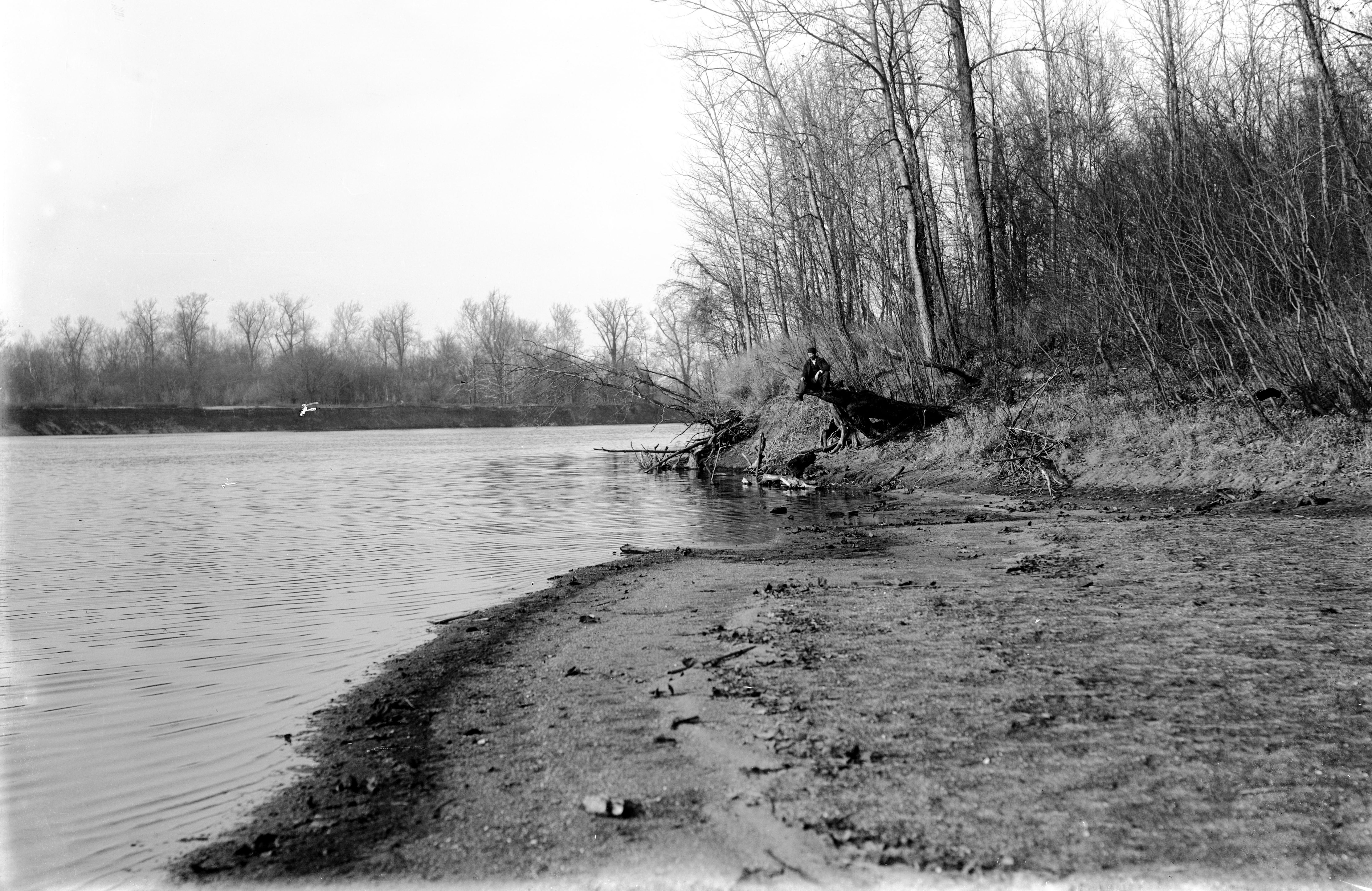 Rocky Island, with a man sitting atop a large stump and looking out over the water. No further information could be found, so this could be Rocky Island or Rock Island, or merely rocky as a description, not a name. This might be the Wabash River or one of its tributaries.
