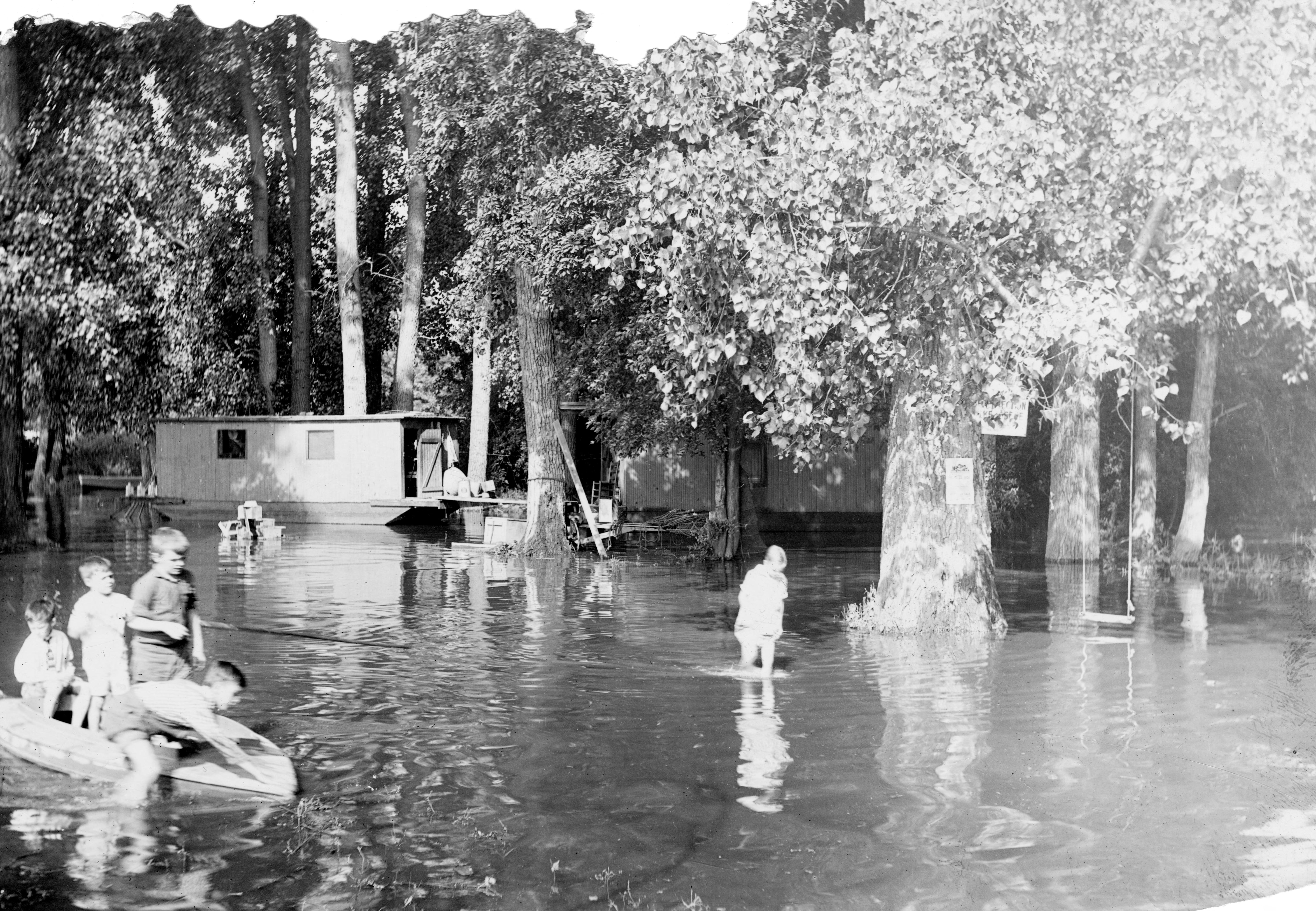 High water at ferry landing, boat with 4 children, little girl in water is Helen Richards.