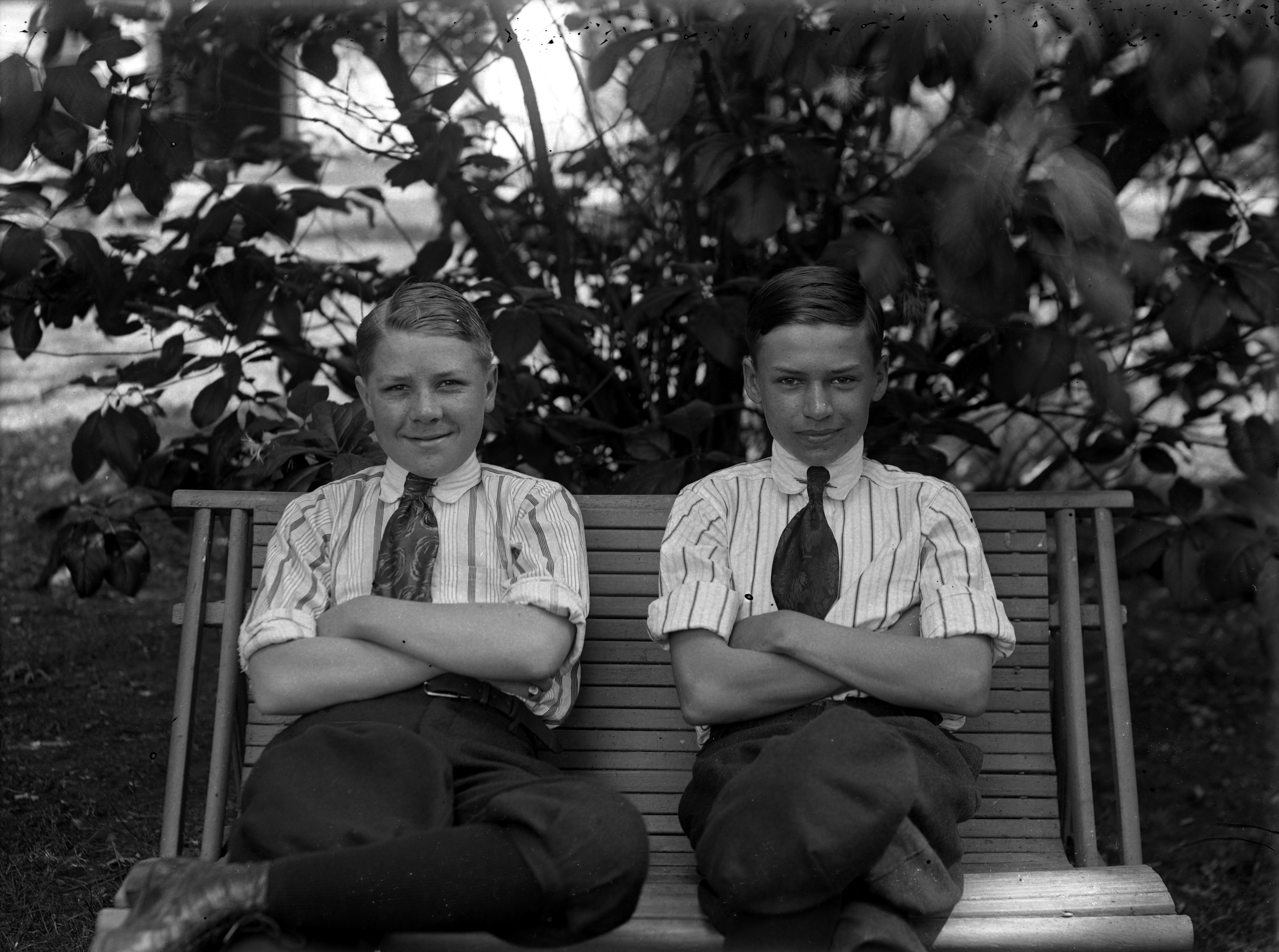 Two boys posing on a bench in front of a shrub. The one on the right appears in profile in MSS 247-6748.