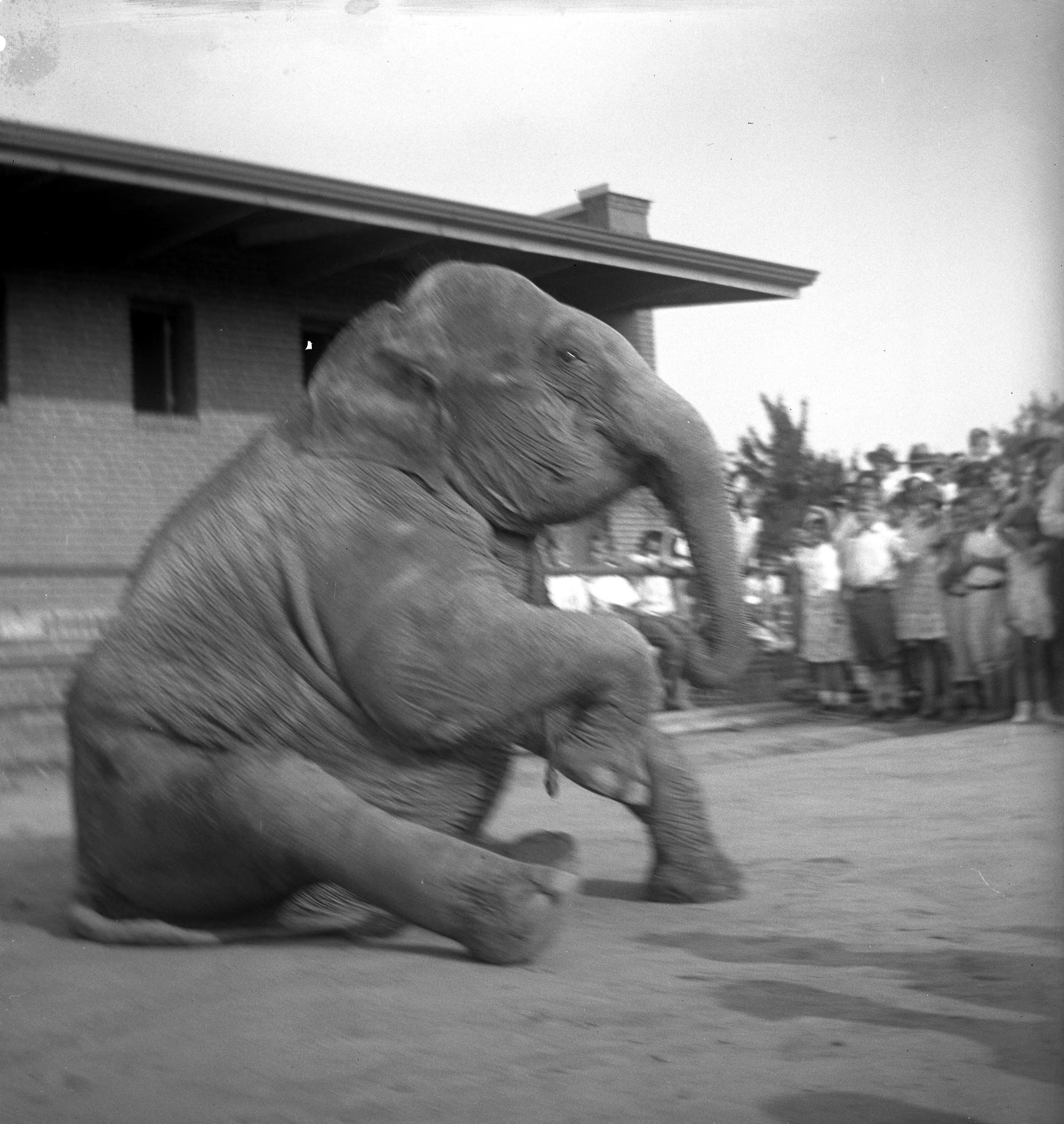 Kay the elephant at Mesker Park Zoo. Cartoons from Karl Kae Knecht graced the pages of the Evansville Courier from 1906-1960. In addition to being a prolific and influential cartoonist and later photographer, Knecht was very civic minded and loved circuses.""In 1928, Knecht helped found Mesker Park Zoo. This occurred after the president of the American Circus Corporation offered Knecht a pair of lions. A year later, Knecht bolstered the fledgling zoo--Indiana�s first--with a successful fund drive to purchase an elephant for the new facility. The elephant, Kay, was named in honor of Karl Kae Knecht." (https://evansvillemuseum.org/events/pen-paper-remembering-karl-kae-knecht/).