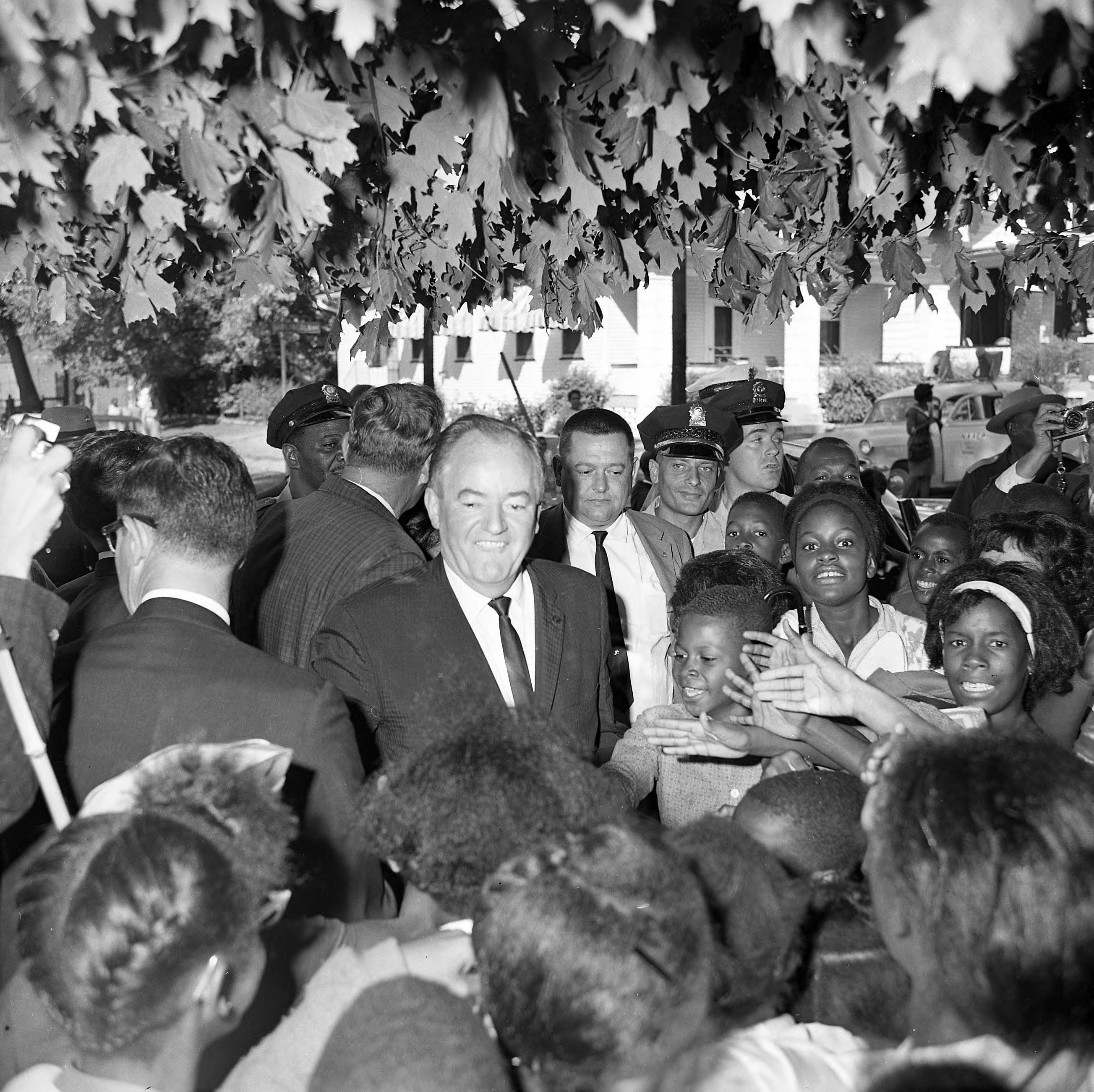 In 1964 then Senator Hubert Humphrey was in Evansville as the vice-presidential nominee on the ticket with Lyndon B. Johnson for president. One of his unscheduled stops was at Lincoln School at 635 Lincoln Ave., and this photograph probably represents that stop.