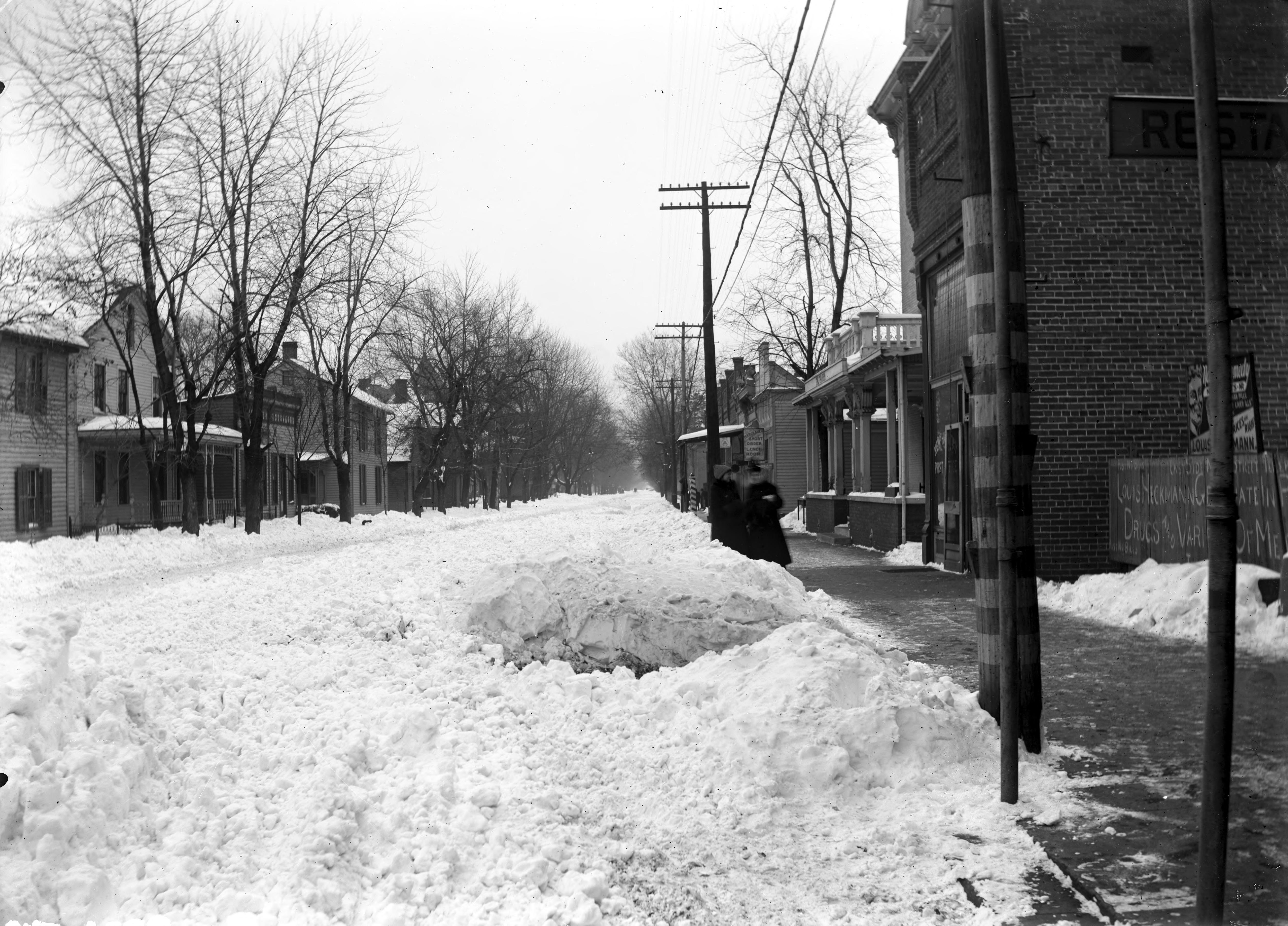 Church St., east from the post office (the first building on the right). Next to this is the New Harmony Tavern and beyond that Hargrave's Short Order Lunch Room. Although no specific information about New Harmony could be found, weather.gov says that December 1917-January 1918 was the coldest and snowiest ever recorded ""in Louisville, Lexington, Bowling Green, and several other locations across southern Indiana and central Kentucky." In mid-December it was so cold that the Ohio River froze over completely. Temperatures rose and there was no snow on ground at Christmas Eve, but a ""massive Canadian high"" came through and temperatures plummeted again and snow fell.""Two to four inches of snow fell on southern Indiana and north central Kentucky on the 25th, helping to set the stage for the cold temperatures to come. By the morning of the 30th a second, reinforcing high came in and was centered just northeast of Lexington at dawn. In southern Indiana temperatures bottomed out at -14� at Madison, -20� at Paoli, and -19� at Salem and Scottsburg. In central Kentucky the coldest readings were -16� at Bardstown and Frankfort, -19� at Junction City, and -20� at Taylorsville. A hundred years later, December 1917 still stands as the 3rd coldest December on record at Louisville and Lexington, #4 at Frankfort, and #6 at Bowling Green. A few more inches of snow fell on the 1st and second of January 1918, and with the exception of a brief respite on the 5th and 6th, colder than normal conditions continued through the first 3 weeks of the new year. As a matter of fact, even after the blistering cold of early December, citizens of southern Indiana and central Kentucky hadn�t seen the worst cold of the season yet. On the 11th yet another dome of incredibly cold air that had organized in northwest Canada pushed into the northern Plains and Rockies while strong low pressure developed rapidly near New Orleans. On the night of the 11th and into the 12th the low continued to deepen and became quite powerful as it shot through the Tennessee and Ohio Valleys to the Great Lakes while the Canadian high nosed as far south as the Texas coast. Though the 11th started off near the freezing mark, the low traveled just to our east and joined forces with the western high to pull frigid air down from Canada. As the low deepened, those winds grew stronger�and stronger�and stronger. By evening sustained winds were in the 20 to 40 mph range across southern Indiana and central Kentucky, combined with blinding snow that had started falling around lunch time and intensified in the afternoon. As darkness fell the blizzard raged, with gusts to 52 mph at Louisville and 44 mph at Lexington. At 7pm in Louisville winds were sustained at 30 mph with a temperature of 13�. The twelfth day of 1918 �was probably the coldest and most disagreeable day experienced in a century� (Monthly Weather Review), or at least since the intense cold of January 1, 1864 (Climatological Data). At 7am, winds were blowing at 20 to 30 mph while the temperature at Louisville was fifteen degrees below zero and Lexington was fourteen below. Using the modern calculation, that gives a wind chill around 45 degrees below zero! Though the snow had ended and the sun came out, the wind continued to roar throughout the day at speeds of 20 to 40 mph with higher gusts. The temperature rose to only -2� at Louisville and -3� at Lexington. January 12, 1918 is still one of only two days in both cities� histories during which the temperature stayed below zero all day. After the storm of the 11th-12th abated, intense cold continued. Every day from the 12th to the 22nd the daily high temperature at Louisville was colder than the normal low temperature (using 1981-2010 normals). Heavy snows fell during this time as well, including 11.2� at Louisville on the 14th-15th accompanied by winds gusting to 45 mph. Transportation was practically paralyzed, including the inter-urbans and streetcars. In Louisville on the 14th three people were killed when two inter-urban cars collided, and the next day four people died when a snow-laden roof collapsed. Fuel shortages added to the misery, and schools were closed for several days. In northern and western sections of Kentucky some rural farmers were snowbound for up to two weeks.""( http://www.weather.gov/lmk/december_1917_january_1918).