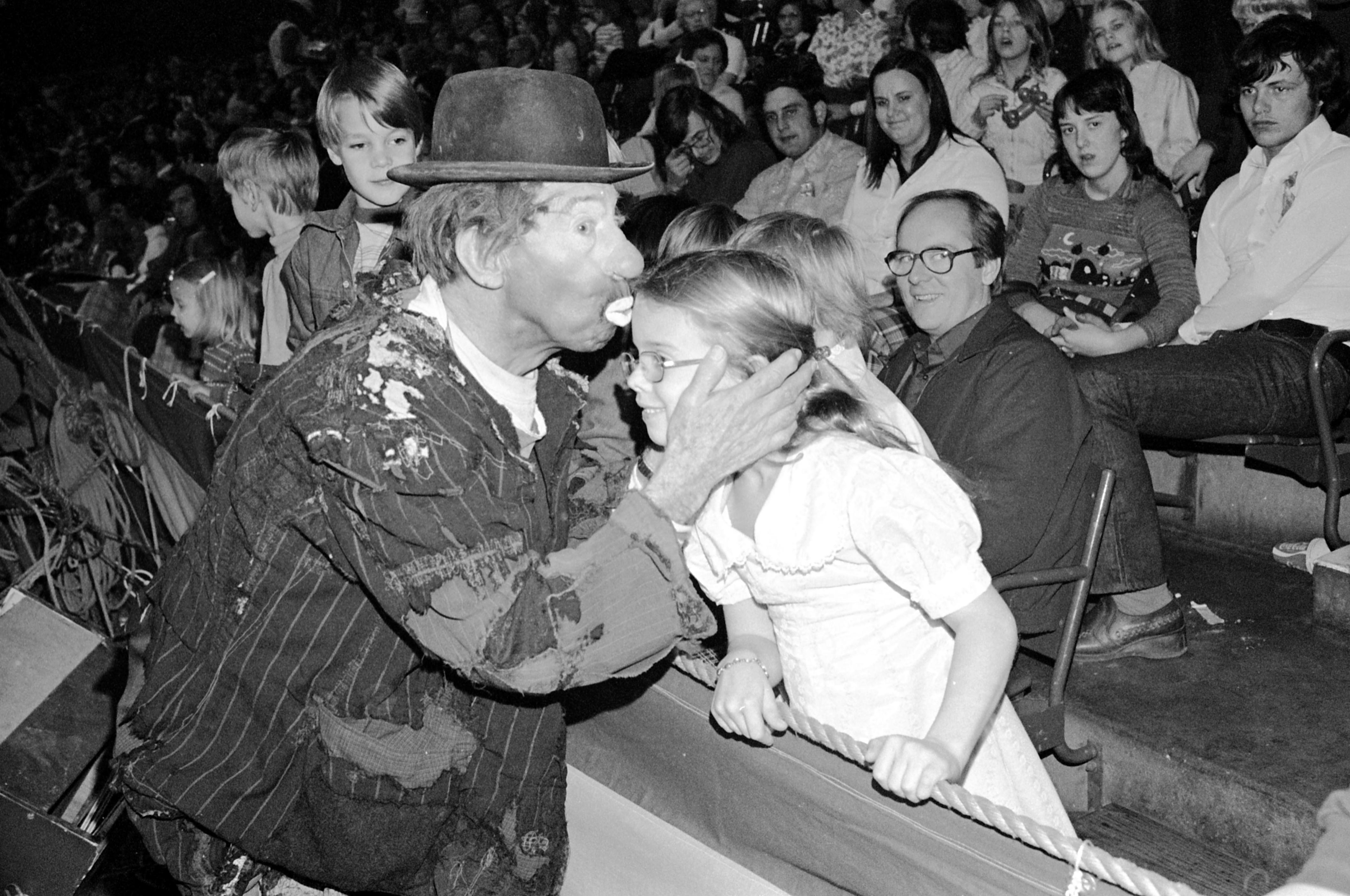 Hadi Shrine Circus clown kissing the forehead of a girl in the audience