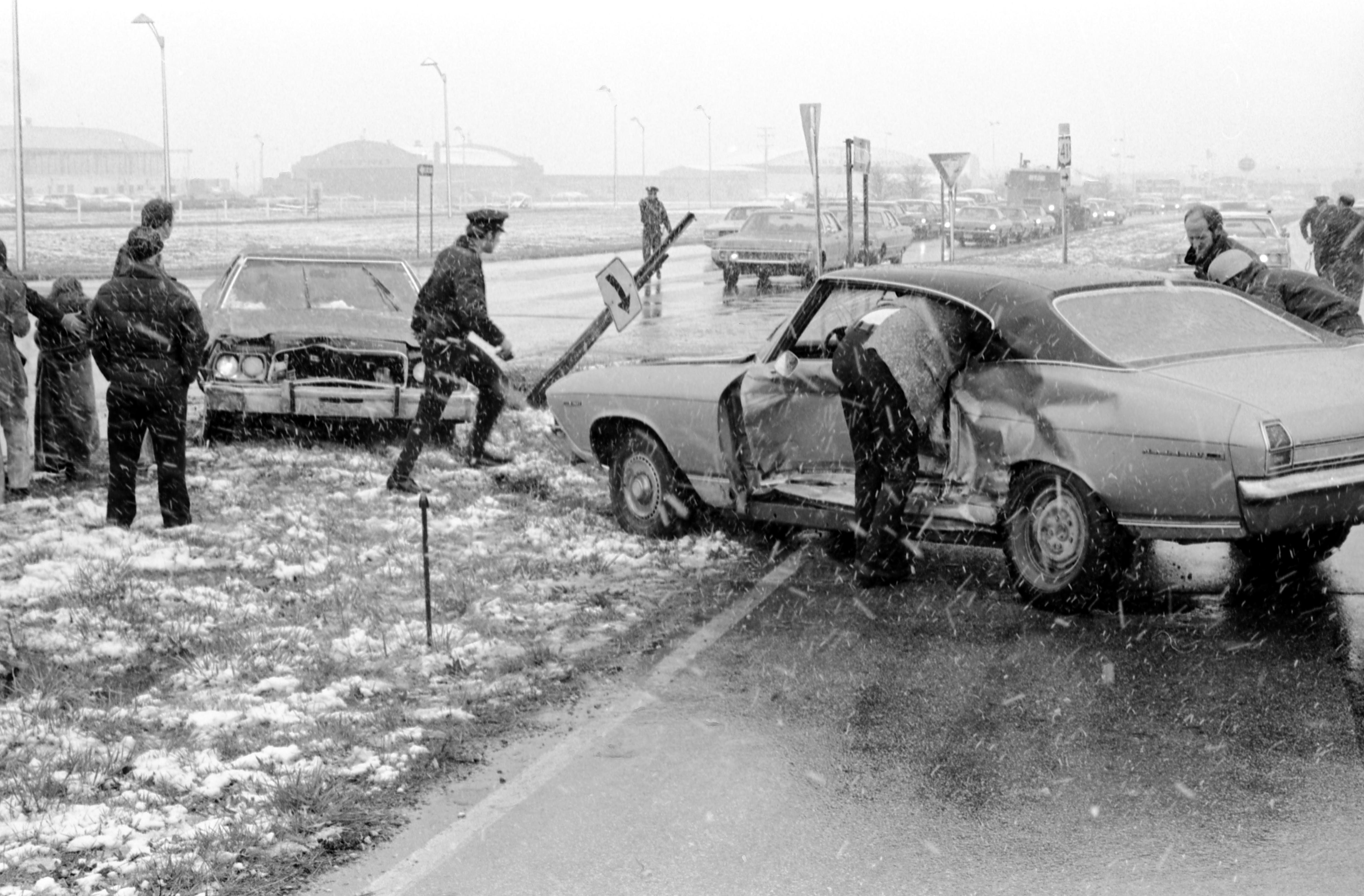 People helping at accident on U.S. Hwy. 41, checking on the passengers. The location appears to be in the vicinity of the airport. A sheriff's deputy stands by and others direct traffic. It is snowing. The wrecked car closest to the camera is a Chevelle. In this photograph you can also see the other car.