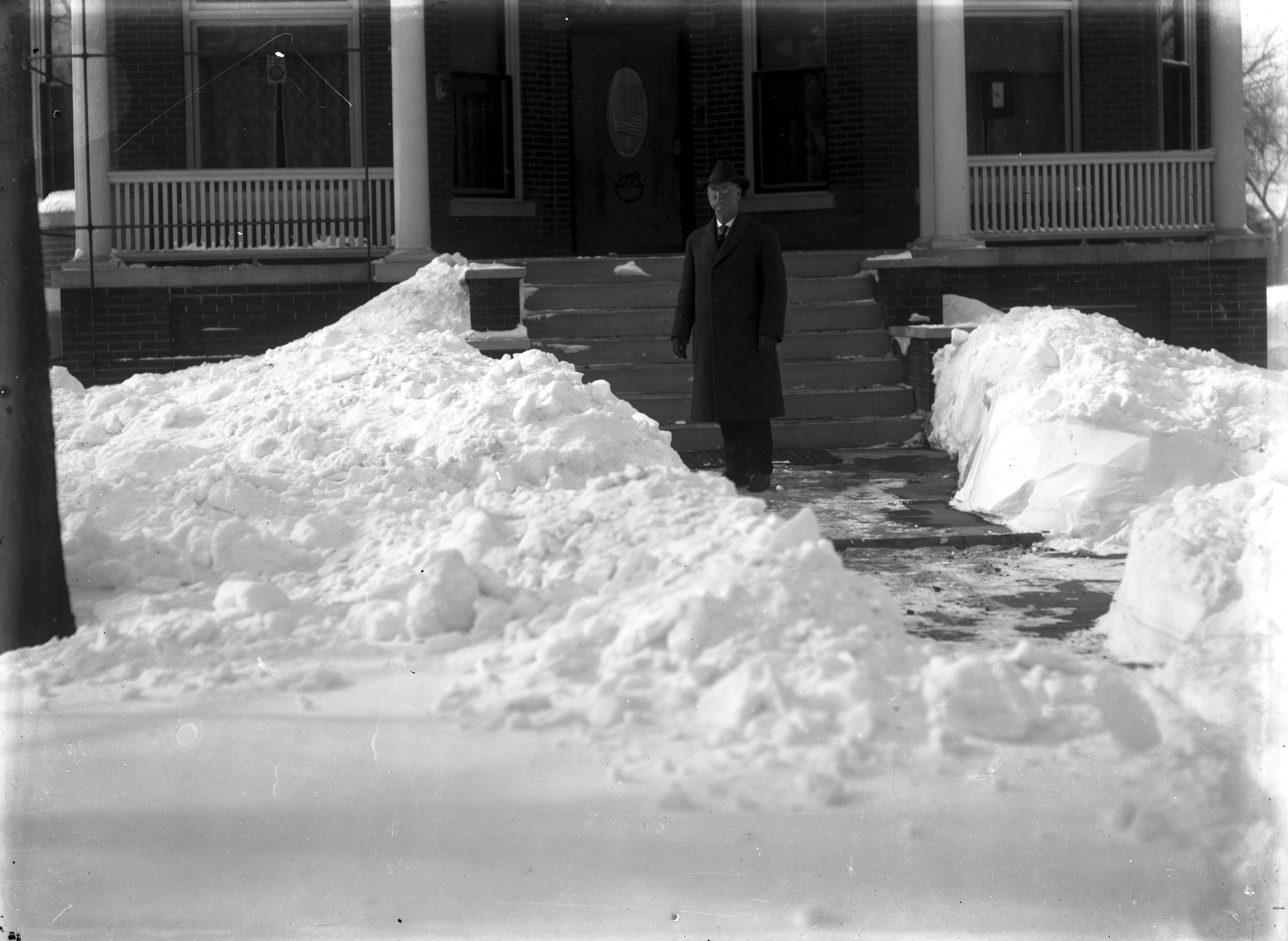 A.C. Thomas standing by steps in front of home, with snow covered yard.