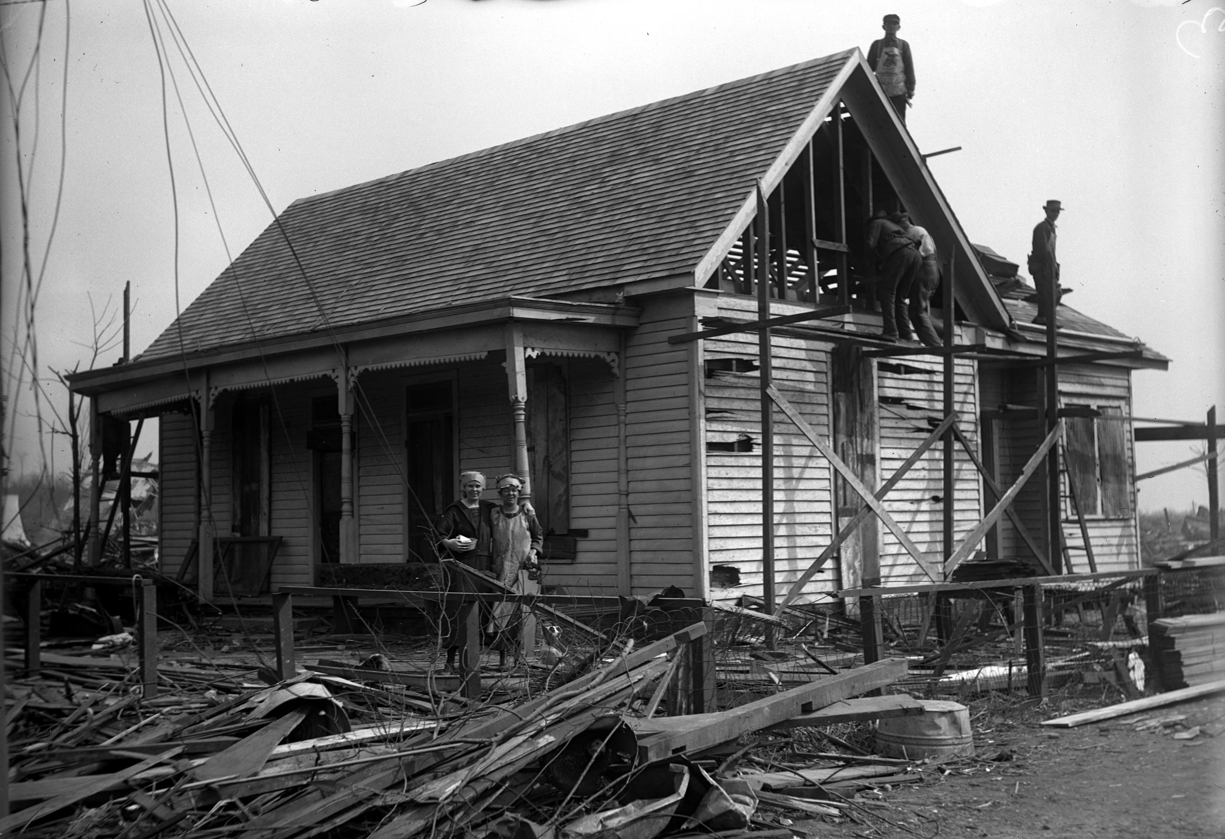 Cyclone damage with Mrs. Walker and George Westherderman in front of N. N. Walker's home.""On Wednesday, March 18, 1925, the longest and deadliest tornado in U.S. history stuck the Midwest. Called the Great Tri-State Tornado, it started at 1:01 p.m. around Ellington, Missouri. It raged for three and a half hours, barreling through southern Illinois and Indiana before finally breaking up after hitting Princeton, Indiana. The 219 mile devastation path included three states, 19 communities, destroyed more than 15,000 homes, injured 2,027 people and leaving 695 dead."" After three and a half hours and 219 miles of destruction, the Tri-State Tornado, the longest and deadliest in the United States, finally began to dissipate 10 miles northeast of Princeton. It left an estimated $16.5 million ($1.5 billion today) in damages. Even worse though was the number of casualties. In southern Illinois alone: 541 were killed while 1,423 were injuried in 40 minutes when the storm blew through Murphysboro, De Soto, Hurst-Bush and West Frankfort. It killed 69 children in nine schools. The Red Cross and National Guards were called in to help in the recovery and cleanup."" De Soto, Gorham and Griffin, Indiana were also virtually annihilated by the Tri-State Tornado. In Griffin, between 69-75 people were killed and 85 farms were destroyed." (http://www.historybyzim.com/2013/07/tri-state-tornado/).