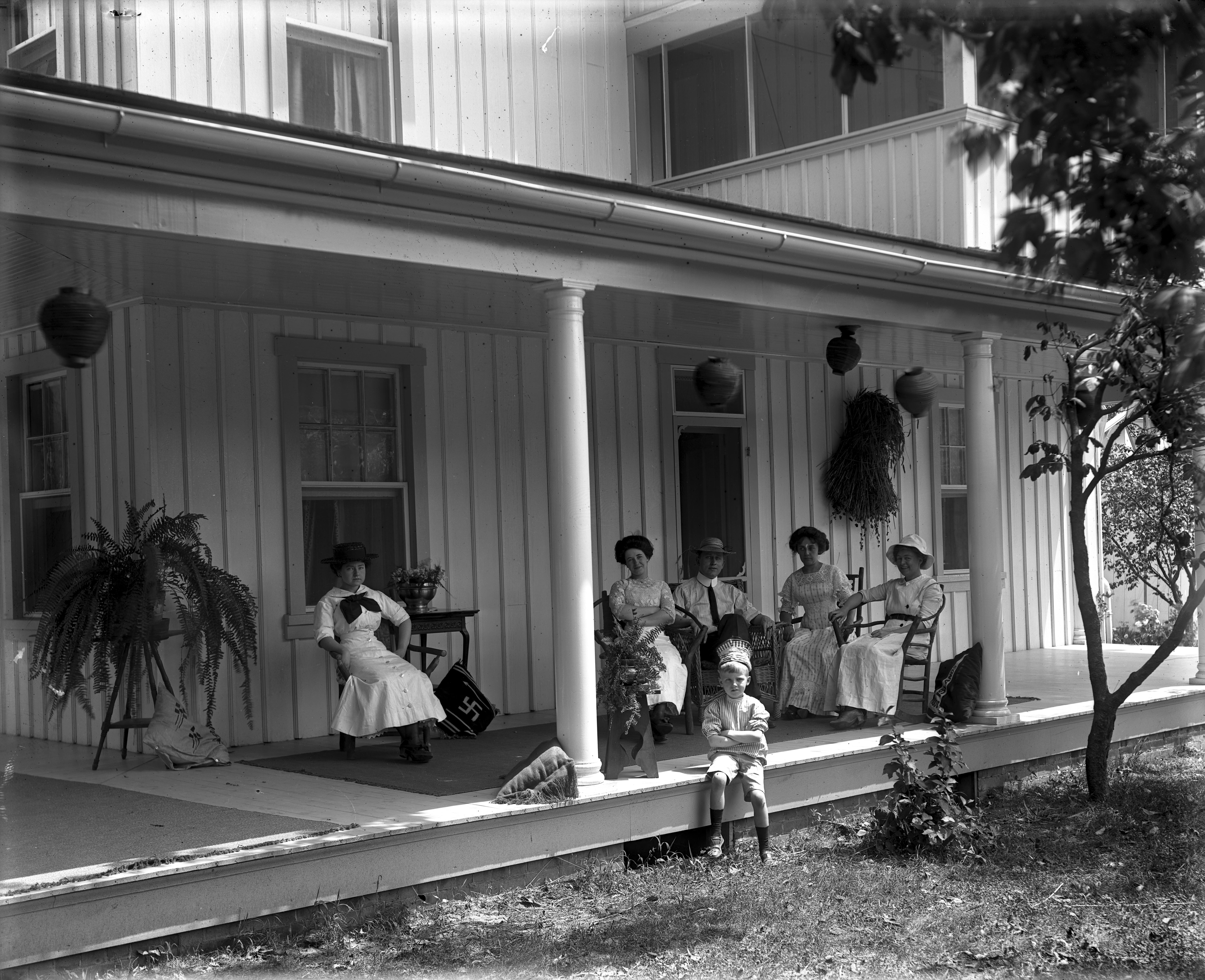 Group of 4 women and 1 man, plus a young boy, on the side porch of Walter Owen's home. The young boy wears a basket/crown of some sort. One of the pillows appears to have a swastika on it. It should be noted that the swastika was ""an ancient religious icon used in the Indian subcontinent, East Asia and Southeast Asia, where it has been and remains a sacred symbol of spiritual principles in Hinduism, Buddhism and Jainism. In the Western world, it was historically a symbol of auspiciousness and good luck," long before it was co-opted by the Nazi party. (https://en.wikipedia.org/wiki/Swastika) NOTE: There was a Walter Dale Owen, a great-grandson of Robert Owen, originator of the 2nd New Harmony experiment. This may or may not be the same person who owns this house.