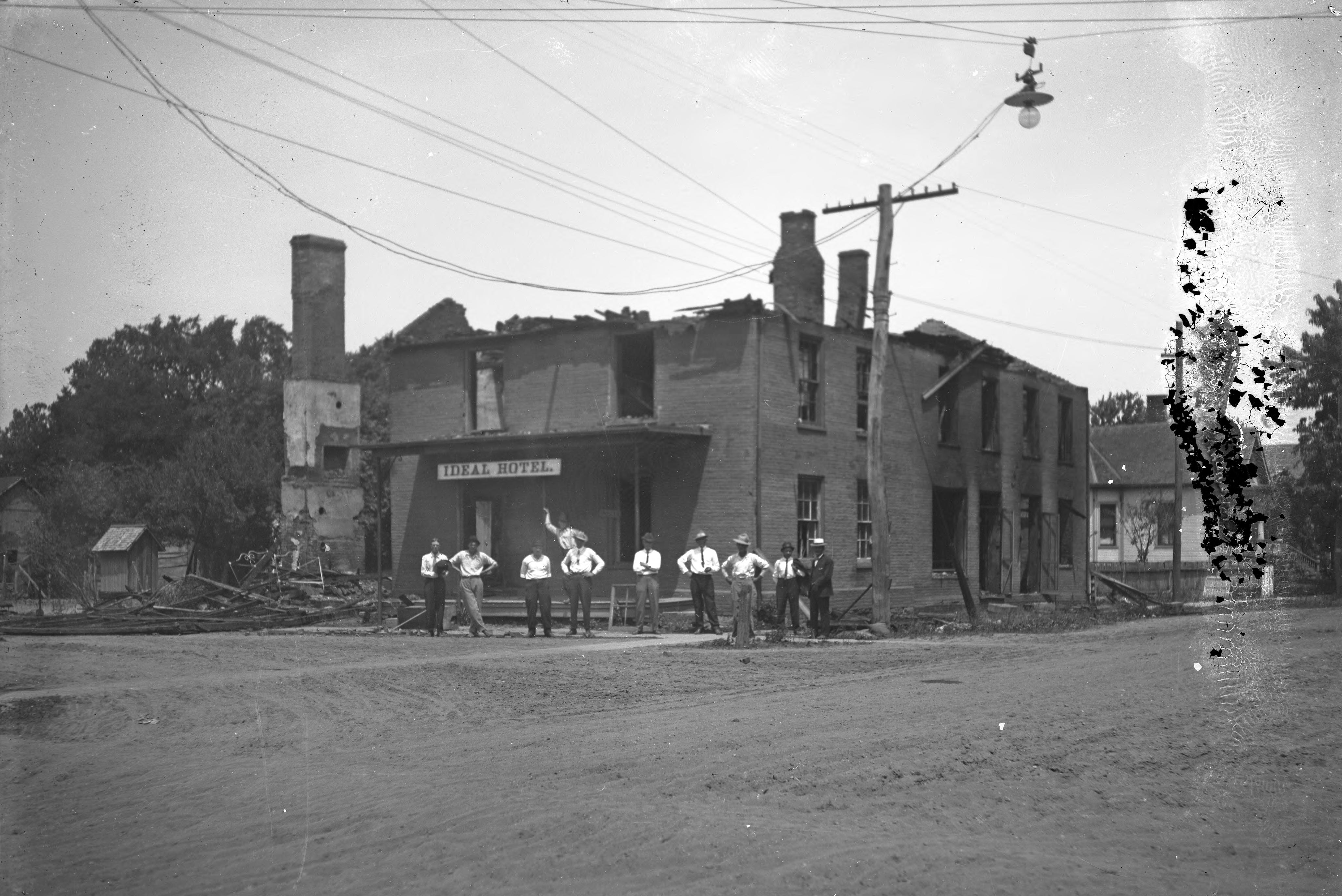 Ten men pose in front of the Ideal Hotel after a fire. It was located on the northwest corner of Main St. and Granary St., and burned May 30, 1913.