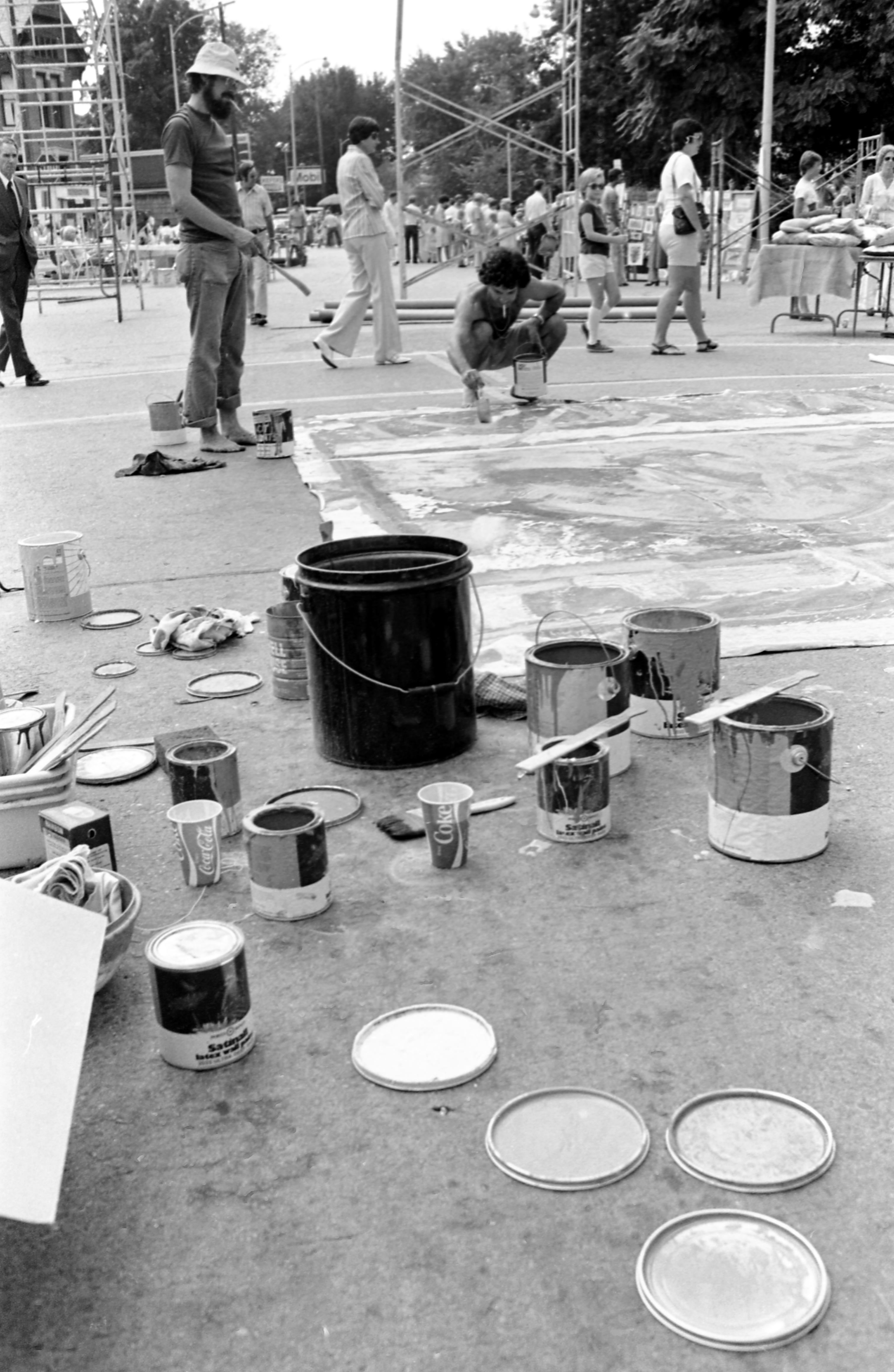 A man paints on the pavement, with paint cans in front of him and people attending what looks like a craft fair behind him.