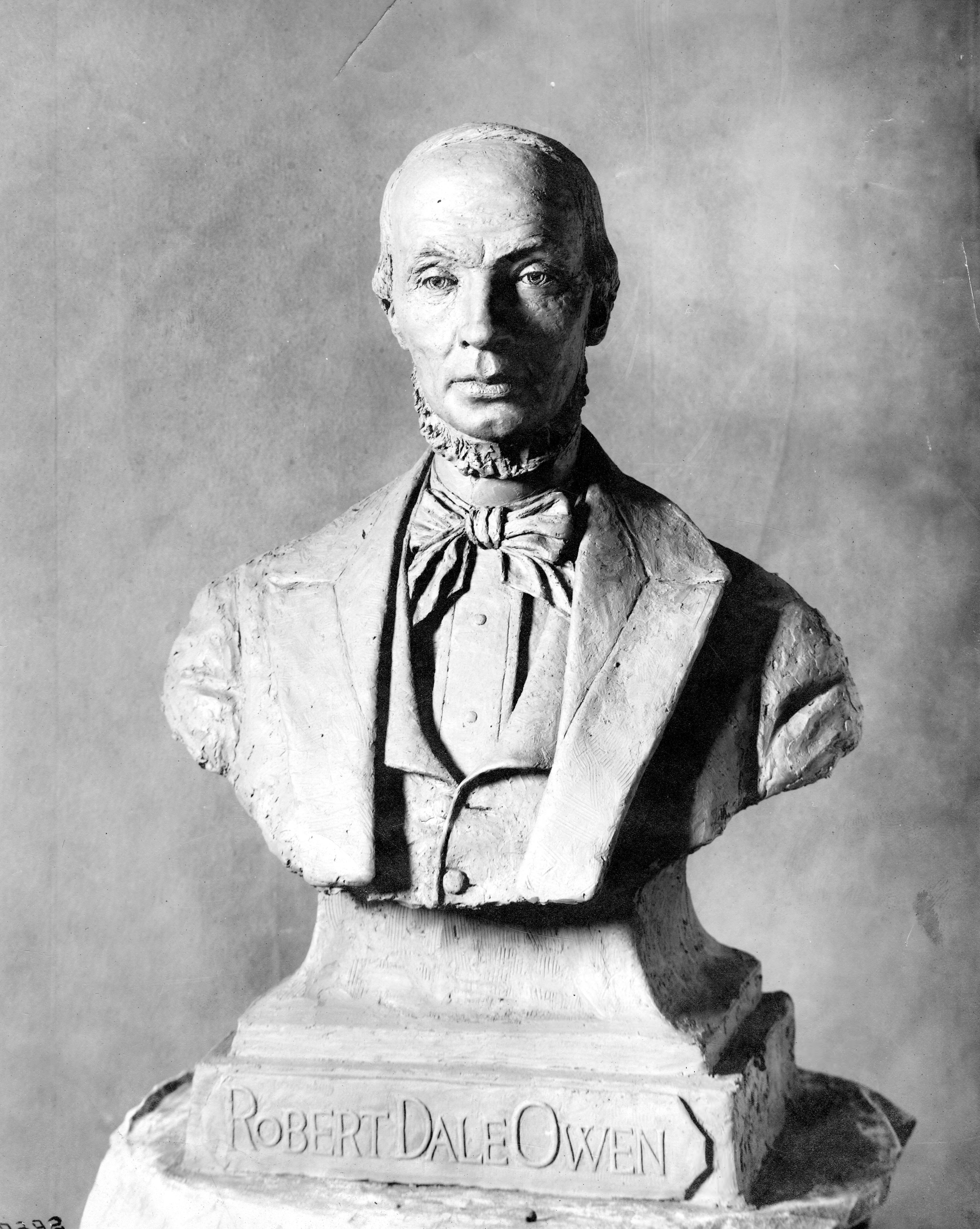 Robert Dale Owen (1801-1877) bust.""Robert Dale Owen was the eldest son of British social reformer Robert Owen. In 1825, both moved to New Harmony, Indiana, where the son soon became editor of the town's first newspaper, the New Harmony Gazette. Robert Owen had purchased the town in order to establish a community based on his principles of social reform. By 1827, the community had lapsed into individualism, the father had returned to England, and the son had begun working closely with social reformer Frances Wright. Together they traveled to her experimental community at Nashoba, Tennessee, then Europe, and then to New York, where he became editor of the radical freethought newspaper, Free Enquirer. By 1833, the freethought movement had waned, and R. D. Owen moved back to New Harmony. He served in the Indiana legislature (1836-38) and U. S. House of Representatives (1843-47), where he introduced the bill establishing the Smithsonian Institution. Owen served as chairman of the Smithsonian Building Committee (link below). Later, he held the diplomatic position of charge d'affairs (1853-1858) in Naples, Italy." (https://faculty.evansville.edu/ck6/bstud/rdowen.html) This bust was sent to the capital in Indianapolis but is now missing.