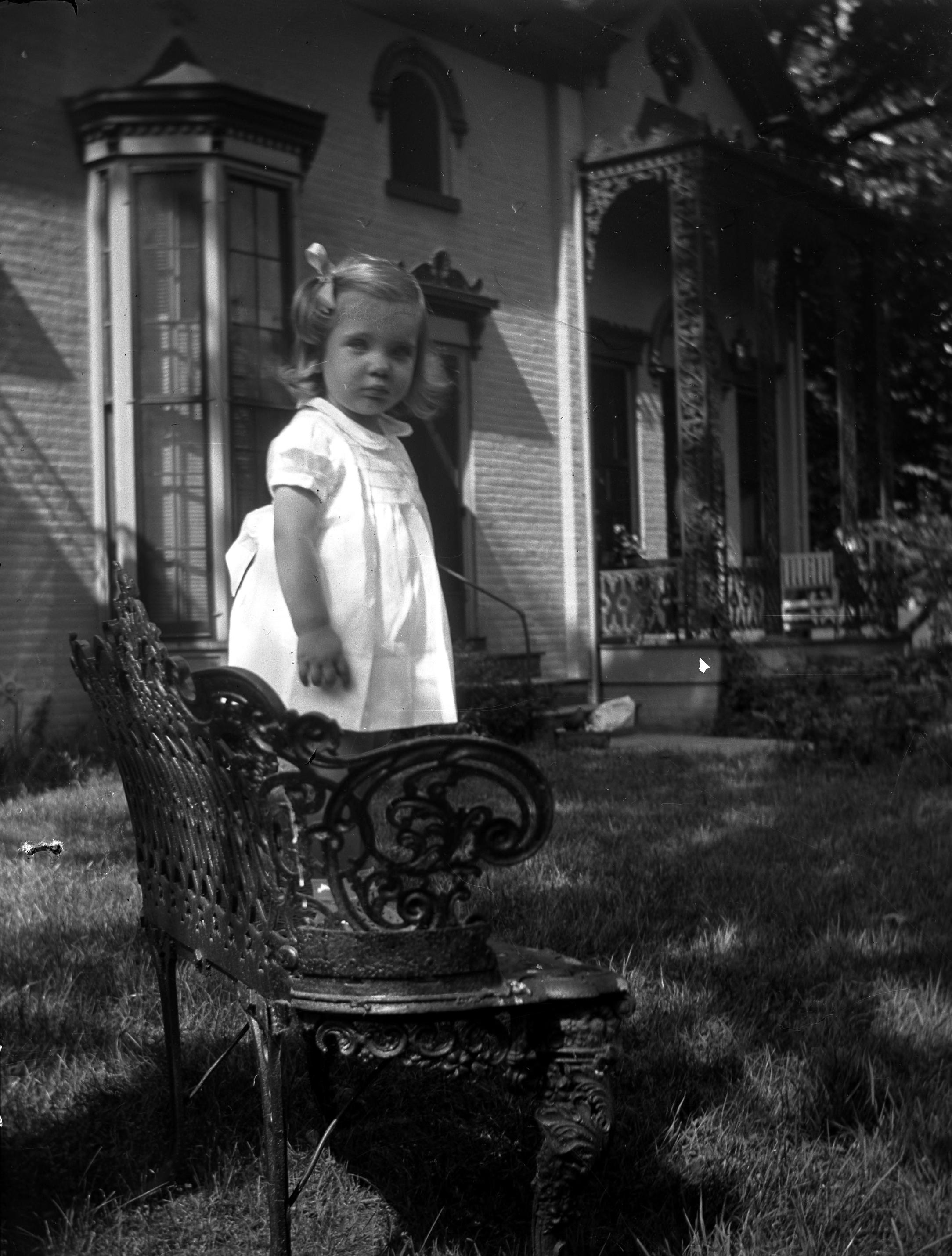 Jane Dale Owen as a little girl, standing on a bench in the yard. Jane is the great-great-great granddaughter of Robert Owen,""the Welsh social reformer and owner of the celebrated textile mills in New Lanark, Scotland. Robert Owen purchased the town of New Harmony in 1825, creating a Utopian community in the hope of bringing educational, and social opportunities to every man, woman and child." (http://www.nytimes.com/2002/05/02/classified/paid-notice-deaths-owen-kenneth-dale.html_).