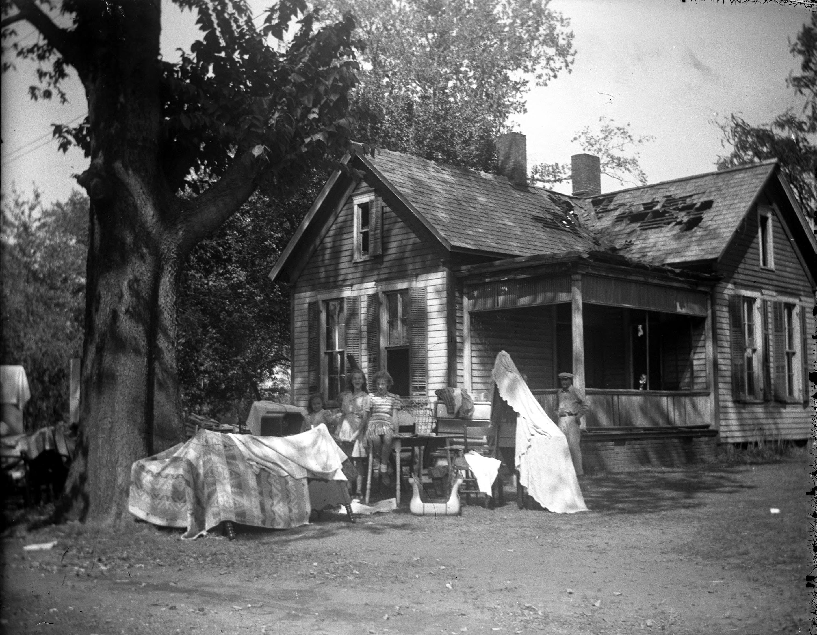 Mae Beal's home on North Street after fire with furniture outside. Damage to the roof is clearly visible.
