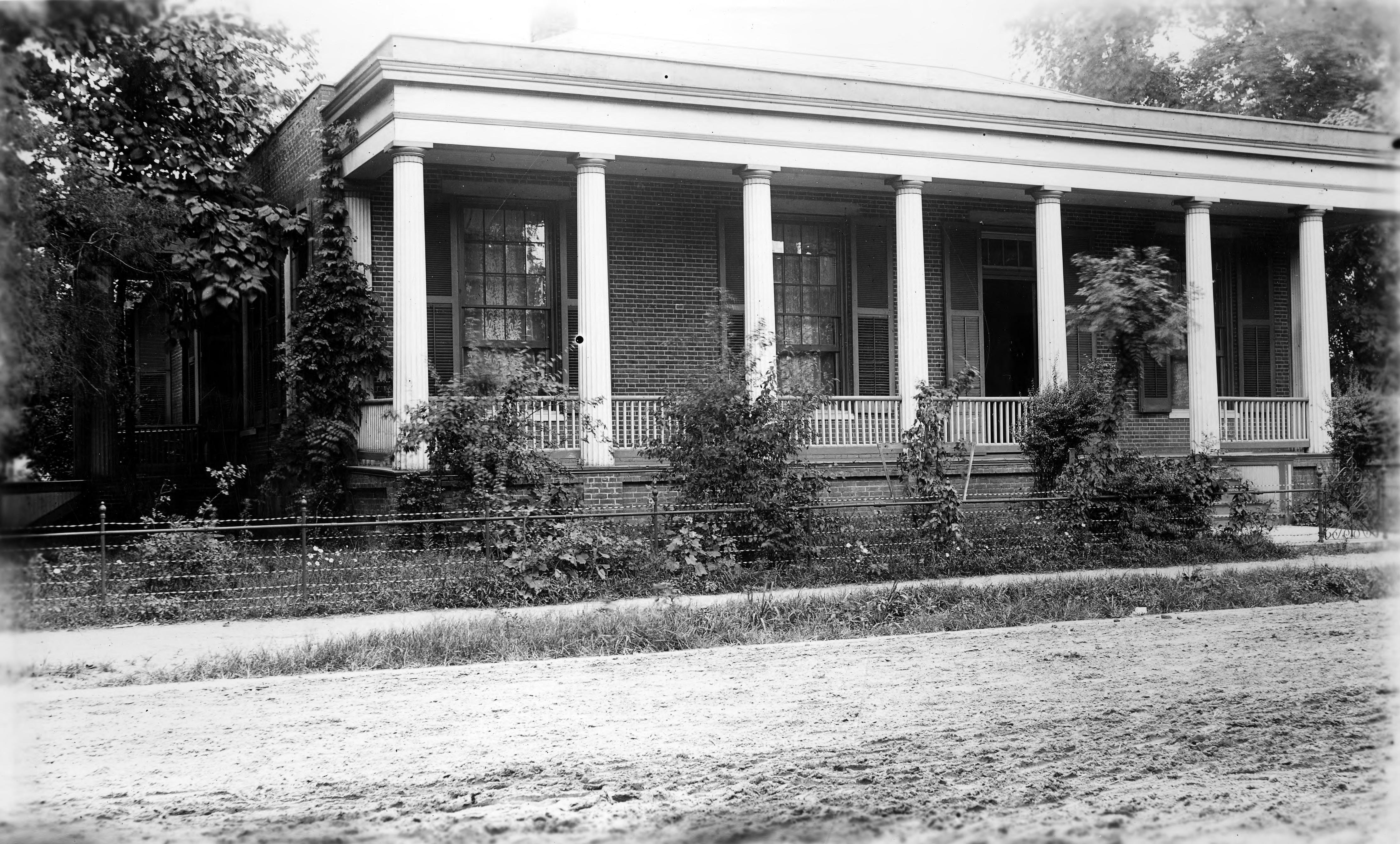 Close-up of Rapp-Maclure-Owen home, at the corner of Main St. and Church St. Today this is surrounded by a brick wall and thus is less visible.""Father Rapp's house (c. 1817-1818) much the same size as Dormitory no. 2, was destroyed by fire in 1844. Only a portion of the stone cellar and original foundation remains. A visitor in 1818 described the house as ""a handsoime brick building where Rapp held a concert once a week." The mansion was sixty feet square and four stories tall with a twenty foot, one-story kitchen on the northwest corner. Each floor contained two long halls running east to west. When Hamonie was sold in 1825, William Maclure became owner and occupant. He was joined there by his two brothers and two sisters. In 1826 one of Maclure's several schools was established in the house, conducted by Mme. Fretageot with her puils who came with her from Philadelphia. In 1831 scientist Thomas Say and his artist wife Lucy Sistaire Say lived in the house. After the house burned in 1844 it was rebuilt by Maclure's brother Alexander in a one-story Greek revival style. In 1850, when Maclure willed the house to Lucy Sistaire Say, she sold it to David Dale Owen. In 1901 the house was sold to the owner of the New Harmony mill. Kenneth Dale Owen, great great grandson of Richard Dale Owen, bought it back into the Owen family in 1948. Restoration was completed in 1990." (Walker, Janet R. Walker's Guide to New Harmony's History. Historic New Harmony, 1996. p. 17-18).
