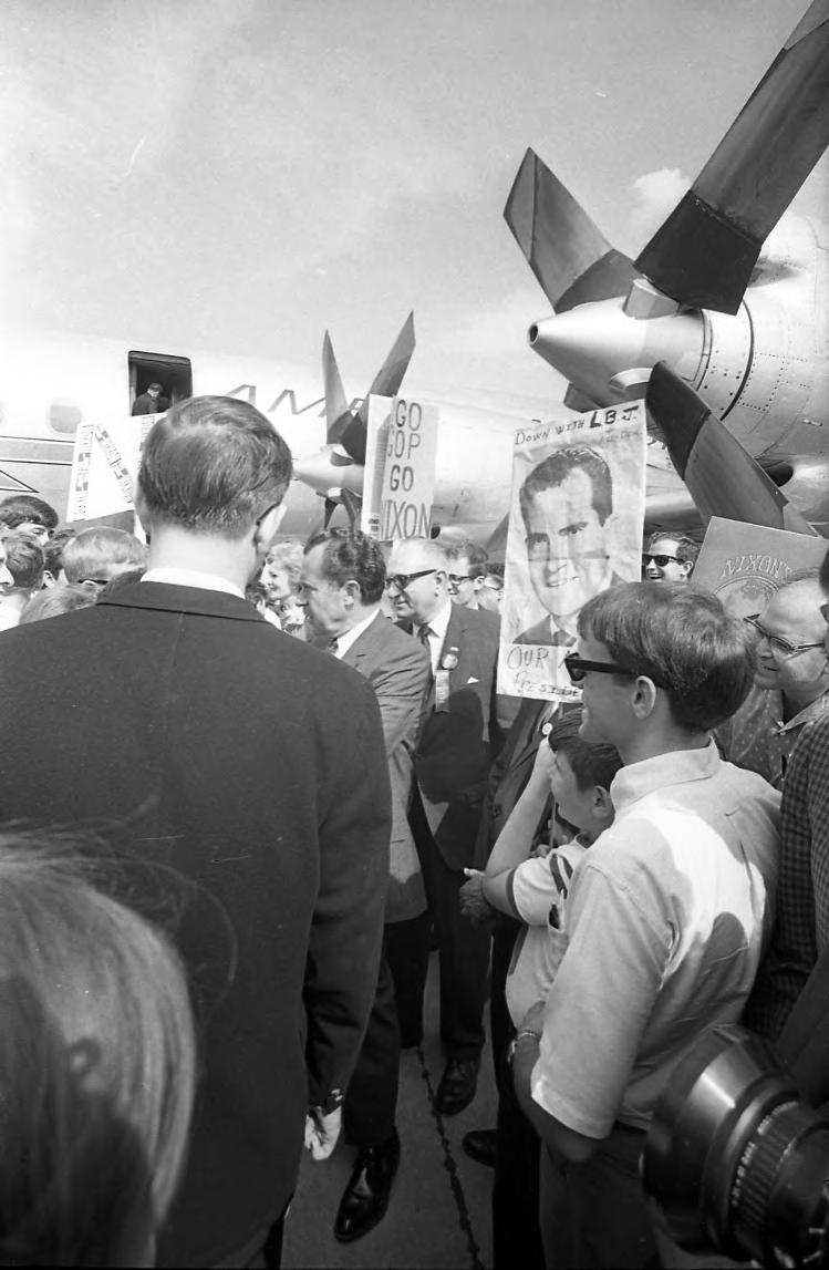Richard Nixon, in town on a campaign appearance for the U.S. presidency, greeting supporters at Dress Memorial Airport. His wife, Pat, is just visible beyond him.