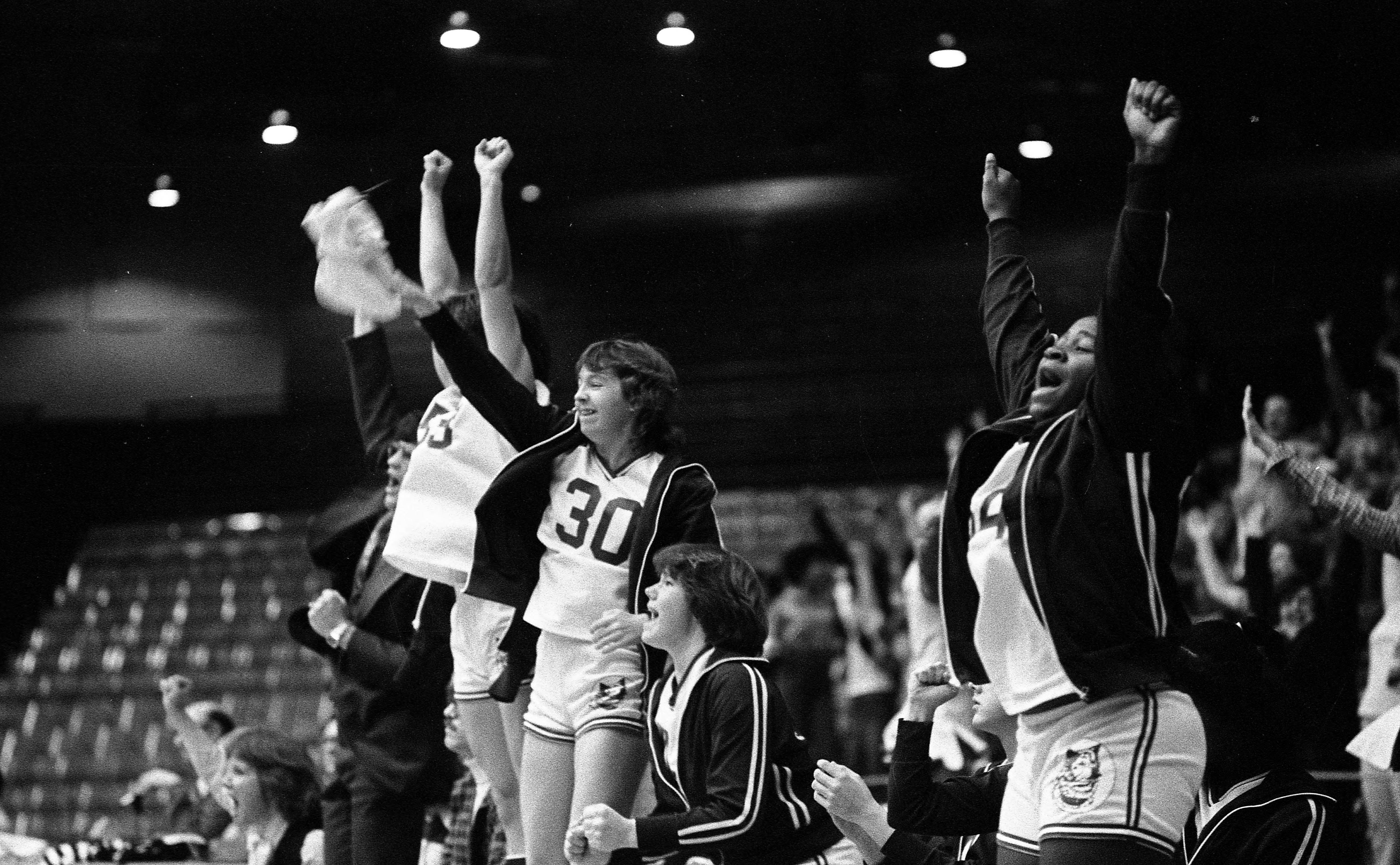ISUE (Indiana State University Evansville, now USI/University of Southern Indiana) Eagles vs. Bellarmine University Knights. ISUE won, 88-84. Here players on the bench are excited, including no. 30, Brad Boling.