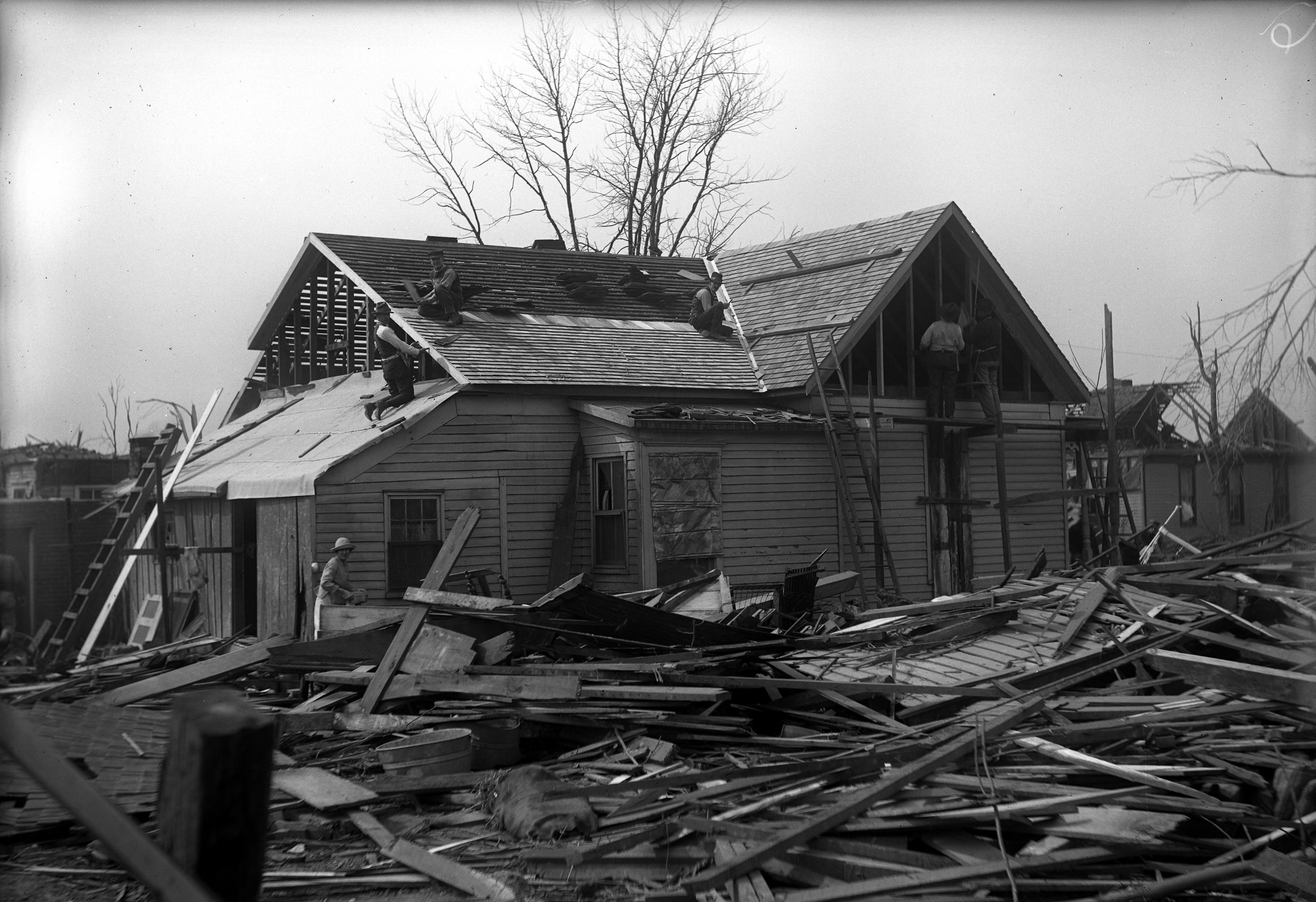 John Fisher's home showing J. A. Behrick gang doing repairs after the tornado.""On Wednesday, March 18, 1925, the longest and deadliest tornado in U.S. history stuck the Midwest. Called the Great Tri-State Tornado, it started at 1:01 p.m. around Ellington, Missouri. It raged for three and a half hours, barreling through southern Illinois and Indiana before finally breaking up after hitting Princeton, Indiana. The 219 mile devastation path included three states, 19 communities, destroyed more than 15,000 homes, injured 2,027 people and leaving 695 dead."" After three and a half hours and 219 miles of destruction, the Tri-State Tornado, the longest and deadliest in the United States, finally began to dissipate 10 miles northeast of Princeton. It left an estimated $16.5 million ($1.5 billion today) in damages. Even worse though was the number of casualties. In southern Illinois alone: 541 were killed while 1,423 were injuried in 40 minutes when the storm blew through Murphysboro, De Soto, Hurst-Bush and West Frankfort. It killed 69 children in nine schools. The Red Cross and National Guards were called in to help in the recovery and cleanup."" De Soto, Gorham and Griffin, Indiana were also virtually annihilated by the Tri-State Tornado. In Griffin, between 69-75 people were killed and 85 farms were destroyed." (http://www.historybyzim.com/2013/07/tri-state-tornado/).