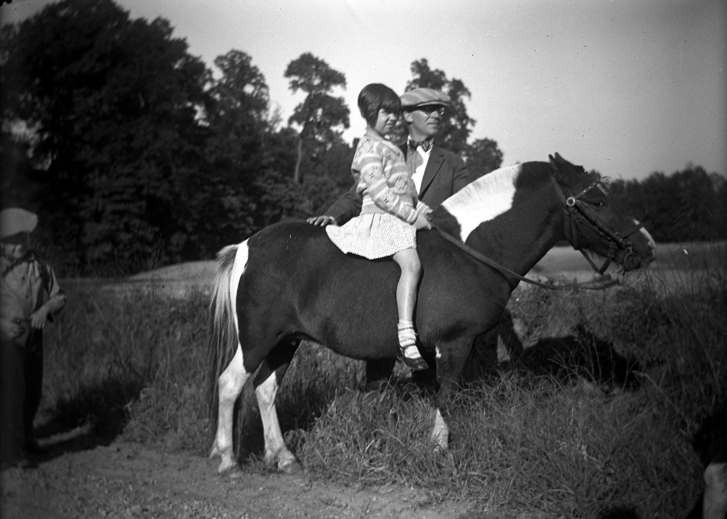 R. E. Clark and Margie Clark on pony at an Eastern Star picnic, in Demberger's woods. A young boy follows them, walking on the path. A Raymond E. Clark (1892-1953) is buried in Maple Hill Cemetery. Those dates would make him an appropriate age for this picture and to have possibly a daughter of this age, but this cannot be regarded as positive identification.