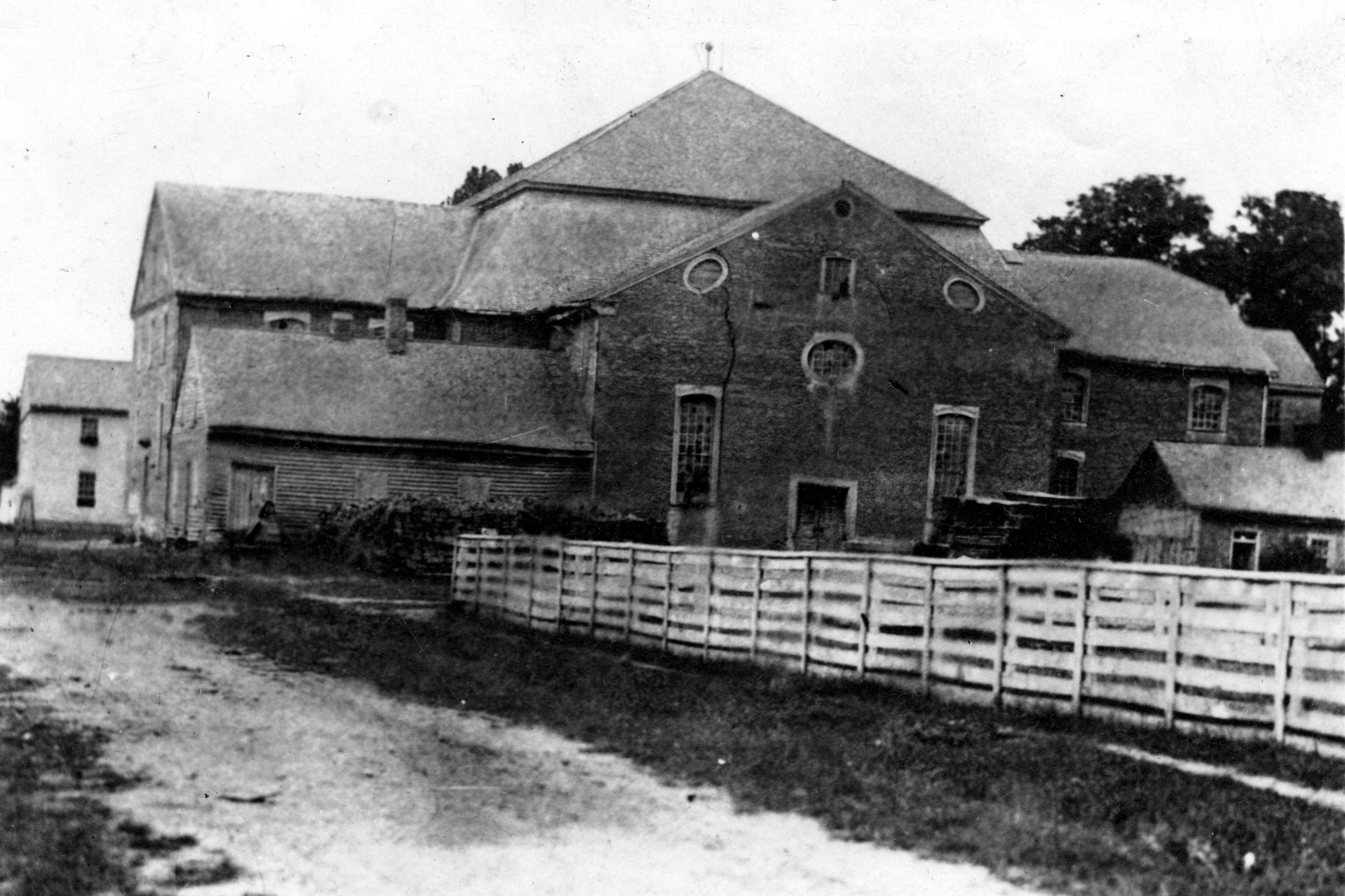 Old Rappite/Harmonist Church, built in 1822 according to plans revealed to Father Rapp in a dream. The shape was a Maltese cross, with each section approximately 120 feet in length. An 80 feet square auditorium formed the center. The second floor and roof were supported by 28 huge pillars. This church was demolished in 1874, with the exception of the east wing. The Harmonists then purchased the lot and donated it and the east wing to the town of New Harmony, along with funds to build a school on this location. Bricks from this church were repurposed into the wall surrounding the Harmonist cemetery. The door from this church was used in New Harmony School. When that school was razed, the door was placed as an entryway into Church Park. (SEE MSS 247-4079)""Johann Georg Rapp (November 1, 1757 in Iptingen, Duchy of W�rttemberg � August 7, 1847 in Economy, Pennsylvania) was the founder of the religious sect called Harmonists, Harmonites, Rappites, or the Harmony Society. Born in Iptingen, Duchy of W�rttemberg, Germany, Rapp became inspired by the philosophies of Jakob B�hme, Philipp Jakob Spener, and Emanuel Swedenborg, among others. In the 1780s, George Rapp began preaching and soon started to gather a group of his own followers. His group officially split with the Lutheran Church in 1785 and was promptly banned from meeting. The persecution that Rapp and his followers experienced caused them to leave Germany and come to the United States in 1803. Rapp was a Pietist, and a number of his beliefs were shared by the Anabaptists, as well as groups such as the Shakers. Rapp's religious beliefs and philosophy were the cement that held his community together both in Germany and in America � a Christian community and commune, which in America organized as the Harmony Society. The Harmony Society built three American towns, became rich, famous, and survived for 100 years � roughly from 1805 until 1905."" In 1804, Rapp was able to secure a large tract of land in Pennsylvania and started his first commune. This first commune, 'Harmonie', (Harmony), Butler County, Pennsylvania, soon grew to a population of about 800, and was highly profitable. At Harmony, the Harmony Society was formally organized on February 15, 1805, and its members contracted to hold all property in common and to submit to spiritual and material leadership by Rapp and associates. In 1807, celibacy was advocated as the preferred custom of the community in an attempt to purify themselves for the coming Millennium. In 1814, the society sold their first town in Pennsylvania to Mennonites for 10 times the amount originally paid for the land, and the entire commune moved out west to Indiana where their new town was also known as Harmony. Ten years after the move to Indiana the commune moved again, this time it returned to Pennsylvania and named their town '�konomie', Economy. The Indiana settlement was sold to Robert Owen, at which point it was renamed New Harmony, Indiana. George Rapp lived out his remaining days in the town of Economy, Pennsylvania, until August 7, 1847, when he died at the age of 89." (https://en.wikipedia.org/wiki/George_Rapp).