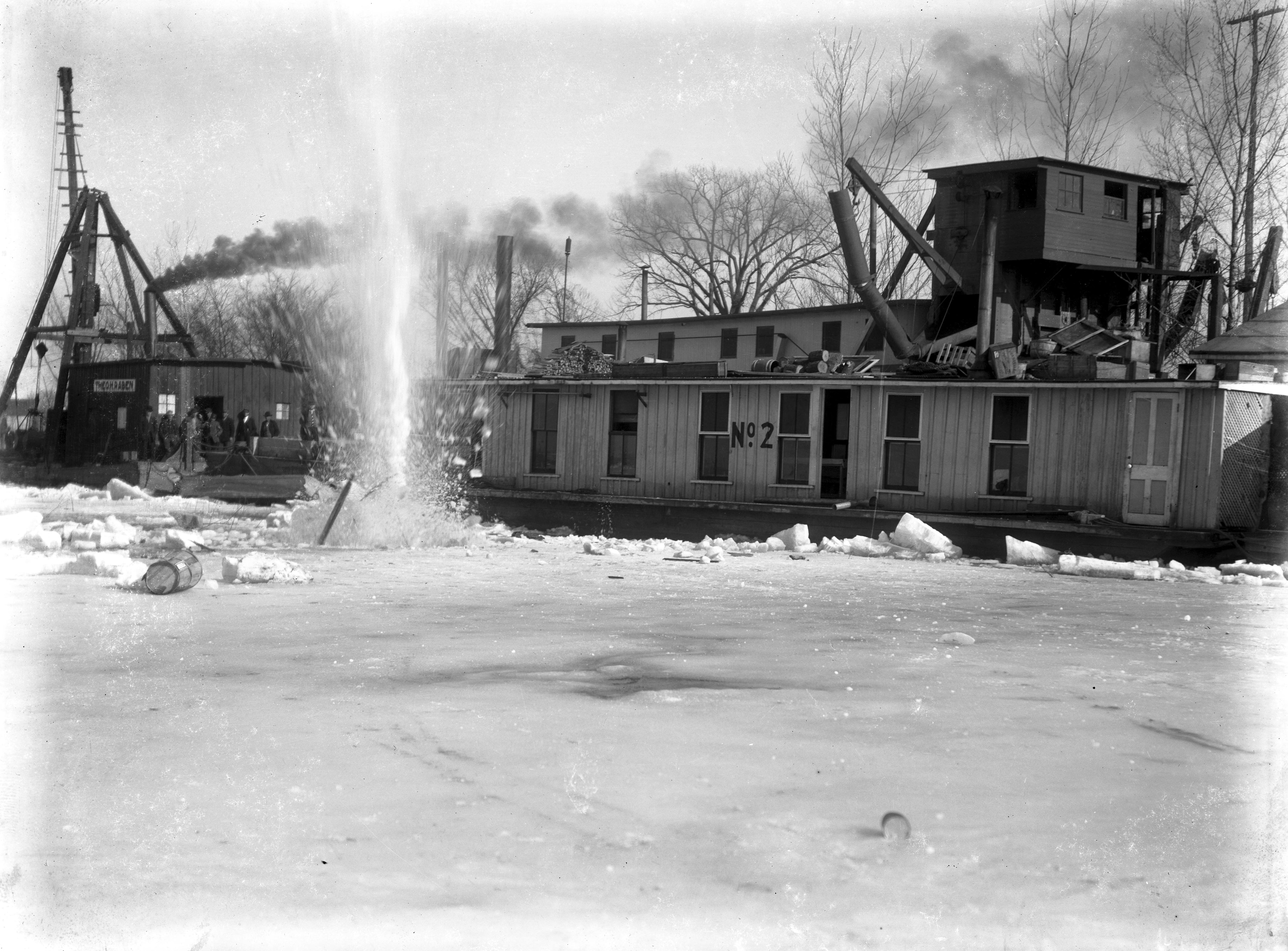 Blasting ice around The O.H. Raben and Wabash Survey Quarter boat no. 2 (U.S. Engineer Dept Louisville, Ky.) on the Wabash River.