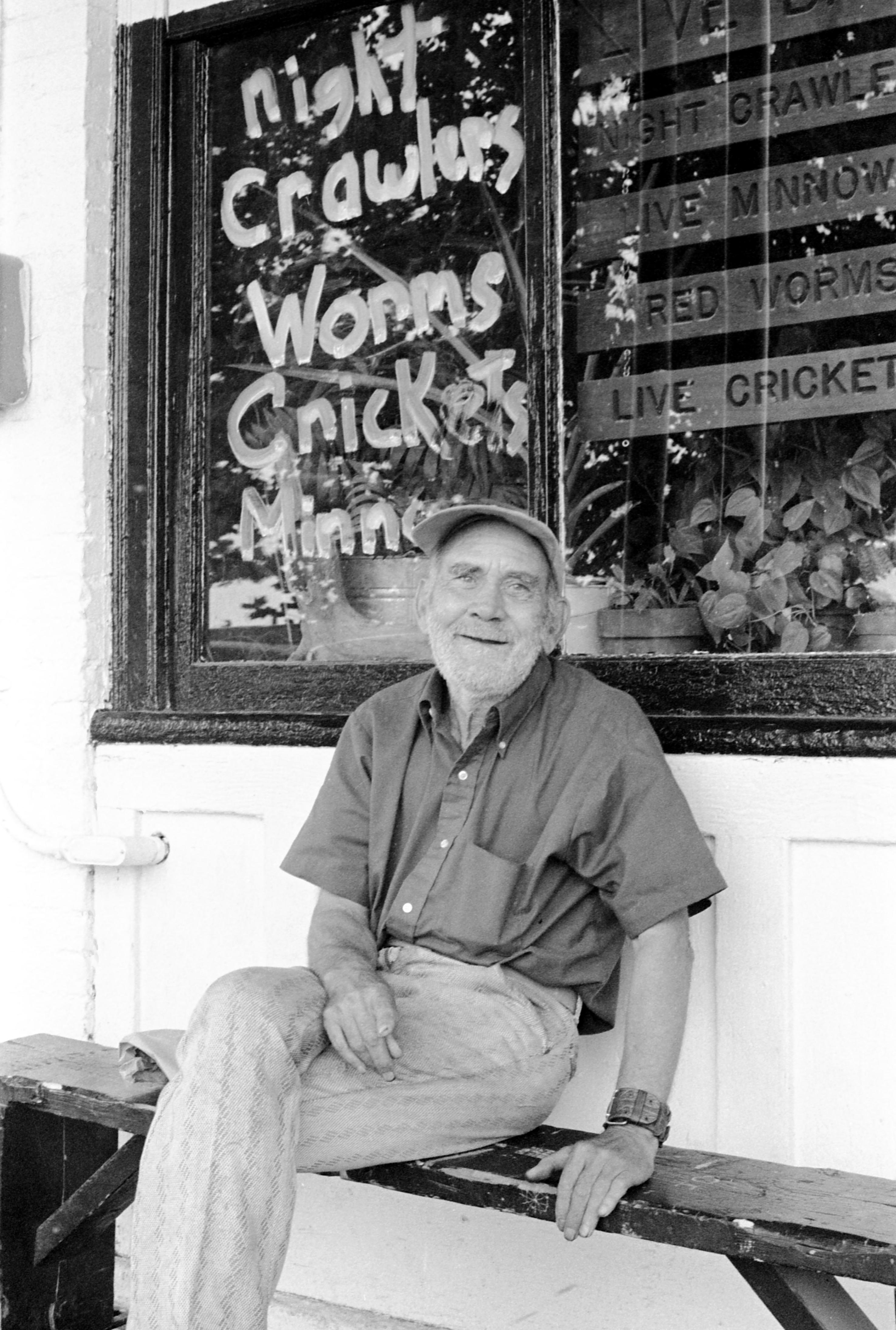 Older man sitting on a bench outside a bait shop (1976 city directory lists 3, so specific location is not identifiable)