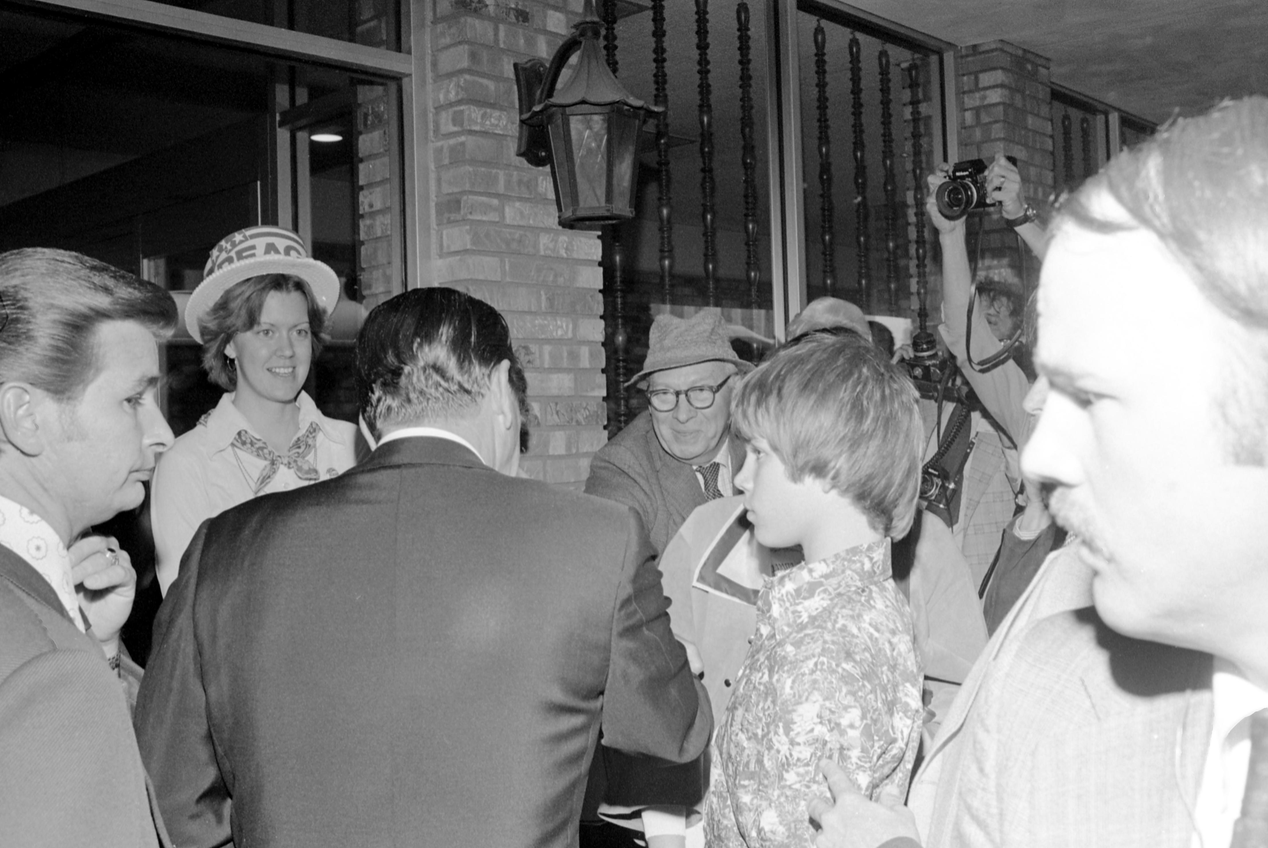 Ronald Reagan, outside the Executive Inn at 600 Walnut St., with a Greyhound bus in the background. He was on the campaign trail on the 2nd of his 3 attempts to win the U.S. presidential nomination.