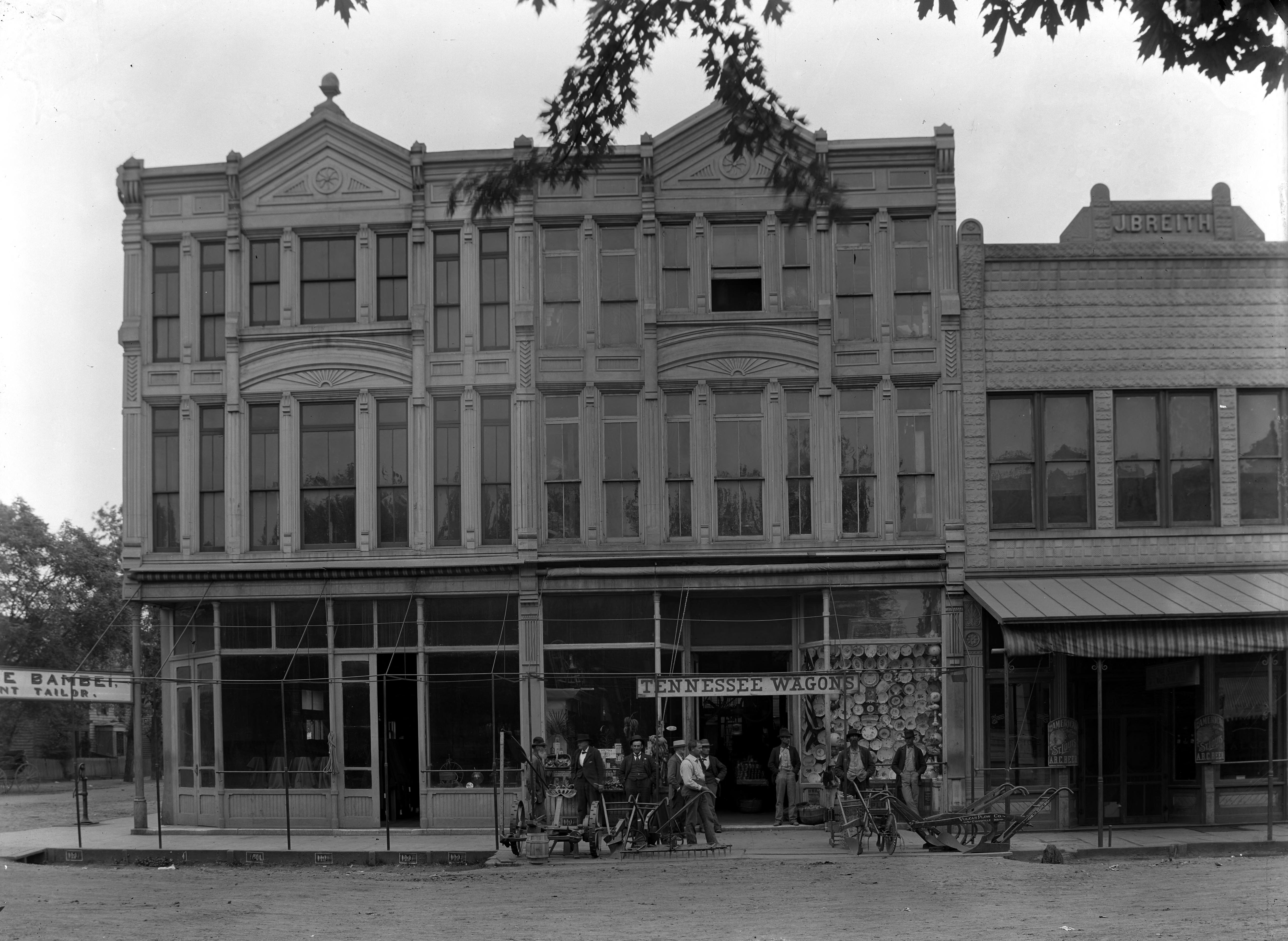 Stores on Main St.--a tailor to the left, and a store selling Tennessee Wagons. One of these is identified as the H.C. Husband & Co. store. Nine men stand in front with pieces of agricultural equipment. Joe Ghump is identified as the one not wearing a hat. The building on the right says J. Breith at the top. These buildings stand today; Church St. is on the left.