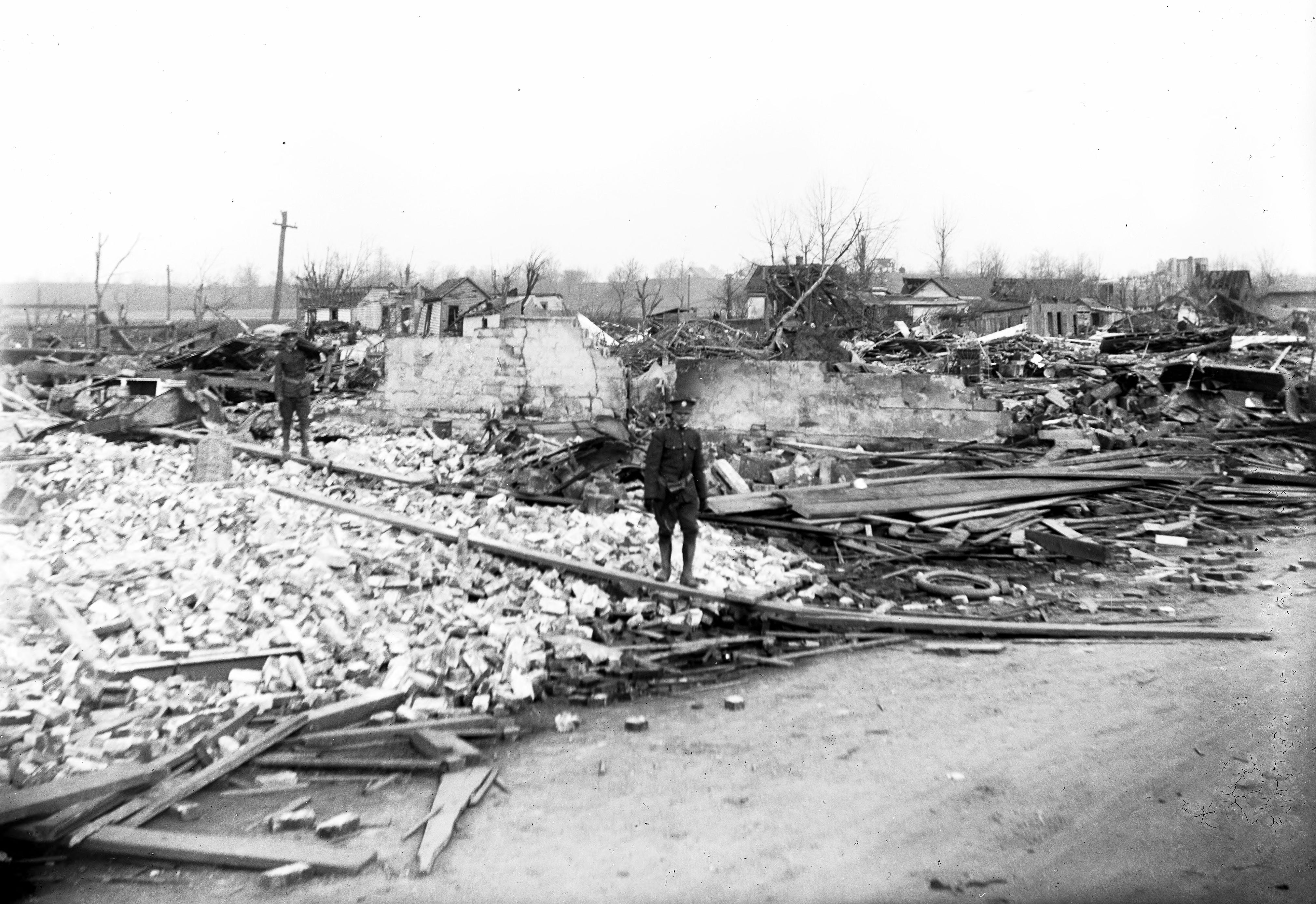 Tornado damage of Main Street from filling station.""On Wednesday, March 18, 1925, the longest and deadliest tornado in U.S. history stuck the Midwest. Called the Great Tri-State Tornado, it started at 1:01 p.m. around Ellington, Missouri. It raged for three and a half hours, barreling through southern Illinois and Indiana before finally breaking up after hitting Princeton, Indiana. The 219 mile devastation path included three states, 19 communities, destroyed more than 15,000 homes, injured 2,027 people and leaving 695 dead."" After three and a half hours and 219 miles of destruction, the Tri-State Tornado, the longest and deadliest in the United States, finally began to dissipate 10 miles northeast of Princeton. It left an estimated $16.5 million ($1.5 billion today) in damages. Even worse though was the number of casualties. In southern Illinois alone: 541 were killed while 1,423 were injuried in 40 minutes when the storm blew through Murphysboro, De Soto, Hurst-Bush and West Frankfort. It killed 69 children in nine schools. The Red Cross and National Guards were called in to help in the recovery and cleanup."" De Soto, Gorham and Griffin, Indiana were also virtually annihilated by the Tri-State Tornado. In Griffin, between 69-75 people were killed and 85 farms were destroyed. (http://www.historybyzim.com/2013/07/tri-state-tornado/).