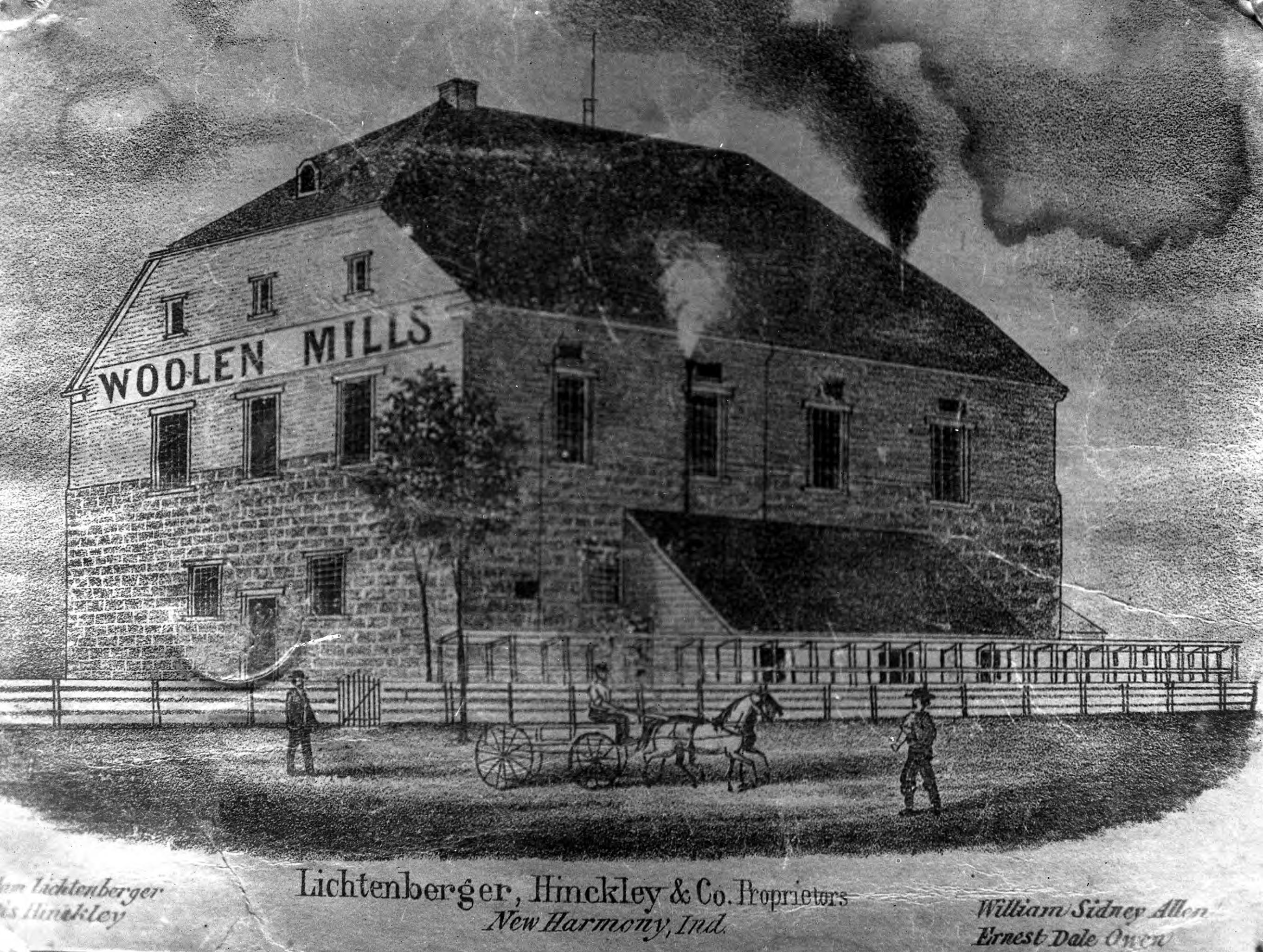 Sketch of Lichtenberger, Hinckley & Co.woolen mills. In addition to Adam Lichtenberger. William Sidney Allen and Ernest Dale Owen are listed. Hinckley's first name cannot be read. NOTE: An Adam Lichtenberger was coroner of Posey County, Indiana November 2, 1863, to November 2, 1865 and also served as a county representative, dates unknown. While this cannot be regarded as a proven correlation between that man and the one represented in this photo, it does seem likely.""Ernest Dale Owen, the third child of Robert Dale Owen, to grow up, born in 1838 in New Harmony, was also trained abroad with the other children and received a cultural education. He became an excellent violinist. He was trained in the law and later moved to Chicago where he practiced for many years. Ernest did not have the altruistic sense of the Owens. When about seventy-five years old, while in a state of mental depression, he committed suicide, this about 1914. His wife was Frances Mann, born 1855, one of three sisters who married into the Owen family." (https://scholarworks.iu.edu/journals/index.php/imh/article/view/6280/6276) This makes him the grandson of Scottish social reformer Robert Owen, who had purchased the town in 1825.