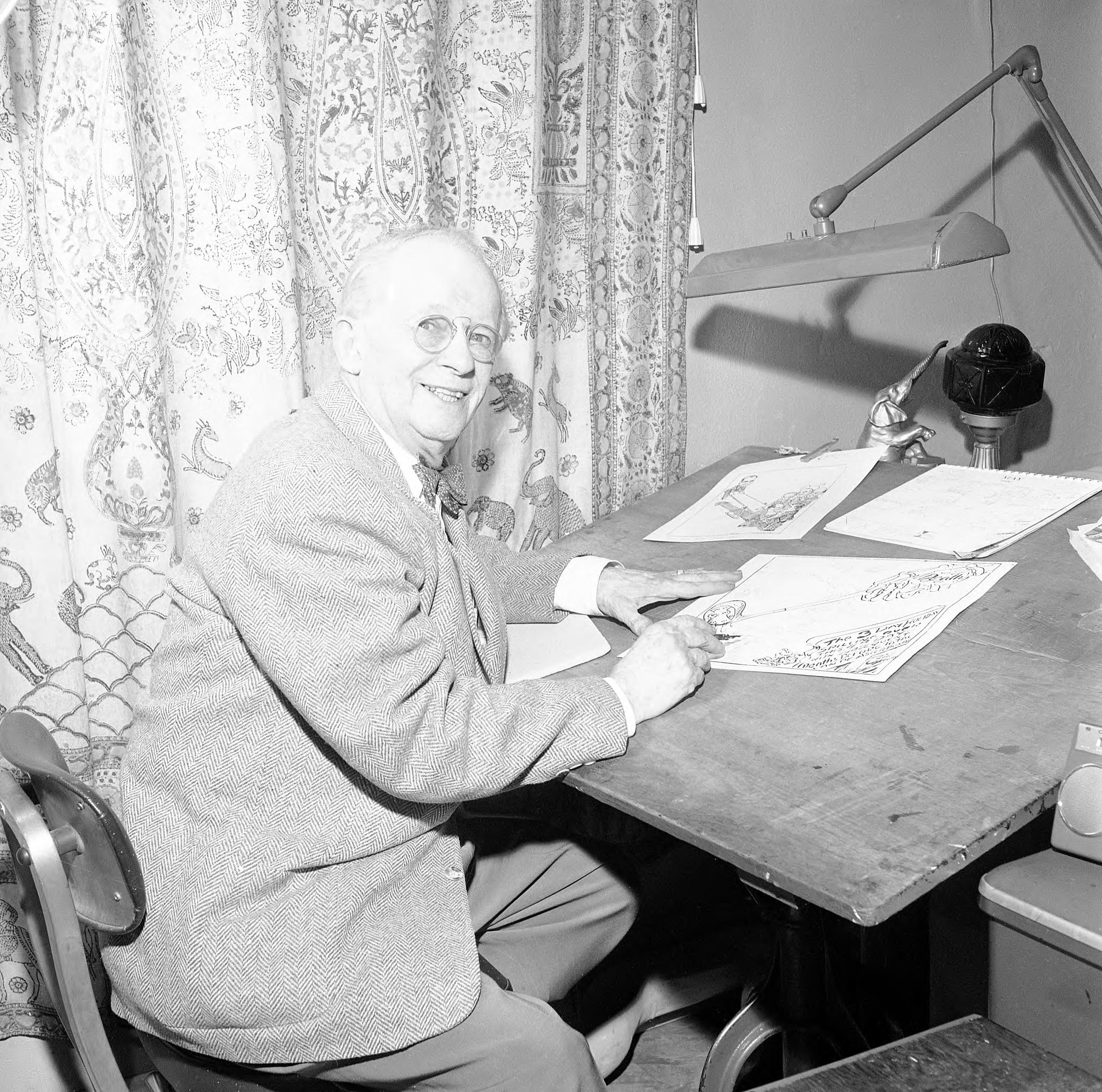 Karl Kae Knecht was a cartoonist, columnist, and photographer for the Evansville Courier 1906-1960. The establishment of Mesker Park Zoo is due in large part to his influence, and Kay, its first elephant, was named for him. Notice the elephant motif in the drapes and the small statue of an elephant. Kay the elephant was nearly always to found somewhere in his cartoons.