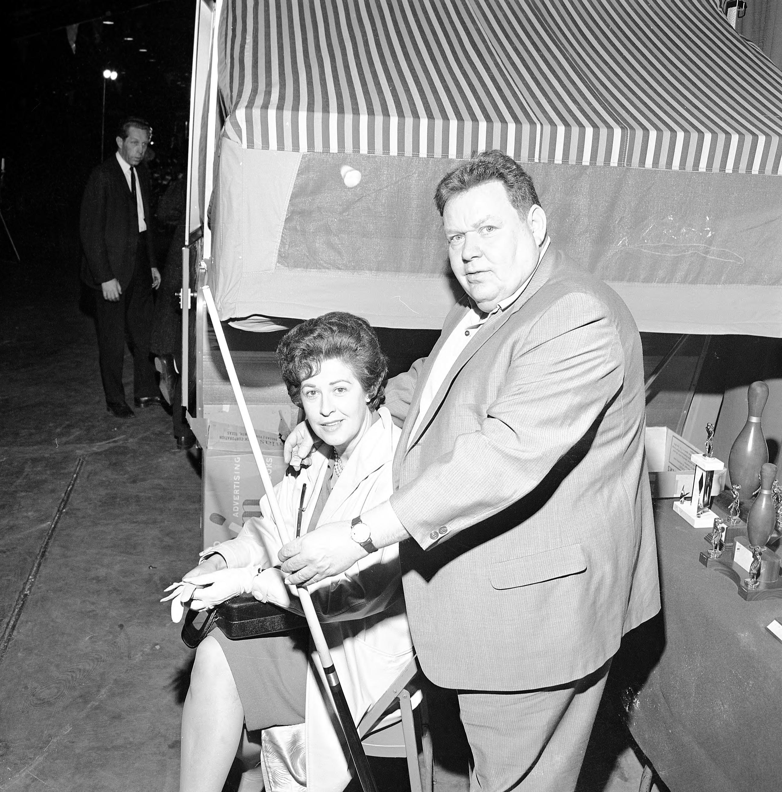 Billiards player Minnesota Fats posing with an unidentified woman at the Tri-State Boat & Sport Show at Roberts Municipal Stadium at 2600 Division St. This facility was razed in 2013.