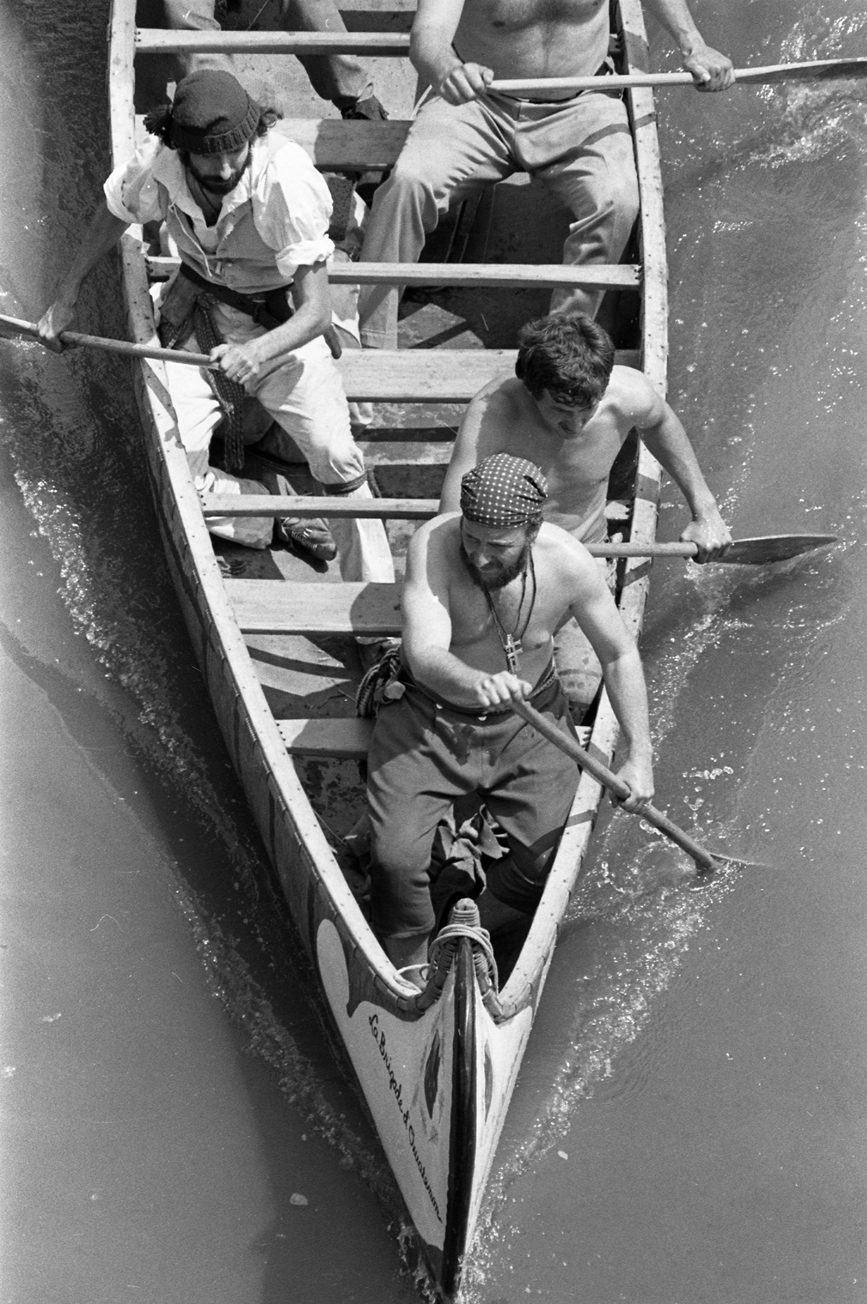 Looking almost directly down into a replica canoe on the Wabash River, in celebration of the Spirit of Vincennes Rendezvous. This canoe bears the name of La Brigade d'Ouiatenon. Fort Ouiatenon was a French trading post near W. Lafayette, IN, also on/near the Wabash River.