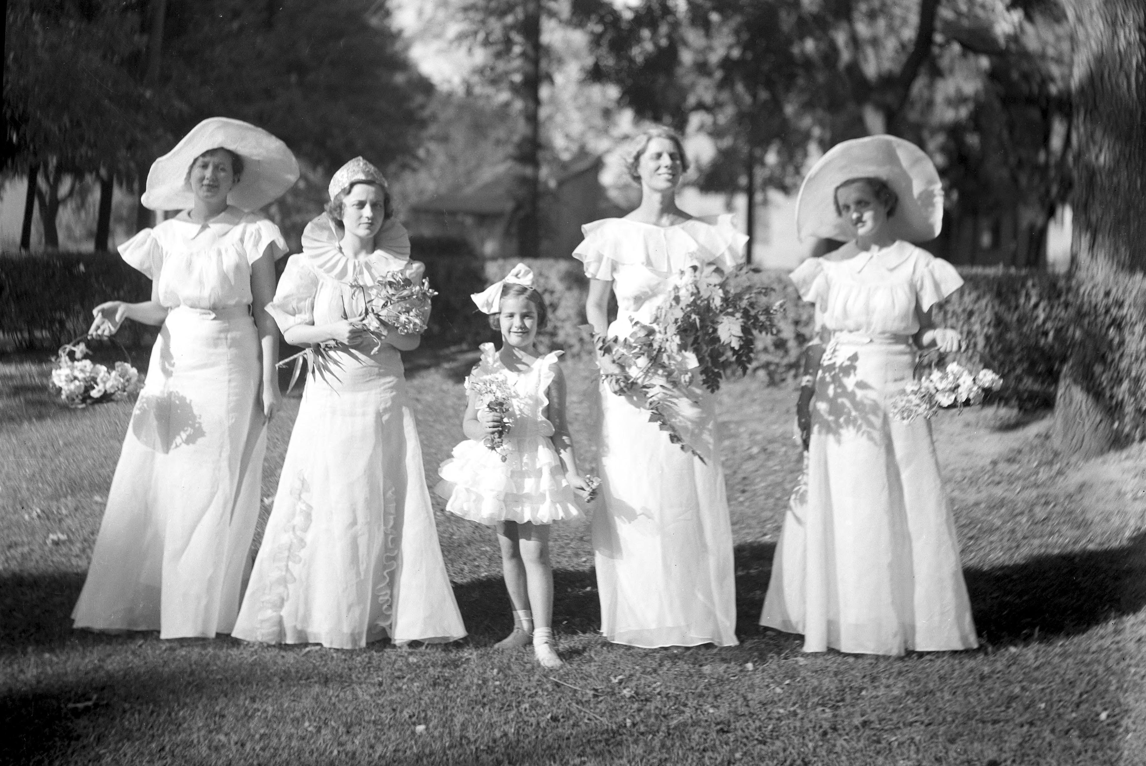 Golden Rain Tree Festival queen and attendants, from left: Helen Ford, Ruth Cox (queen)" Nancy Jan Heckman , Ena Long, and Helen Pfister.