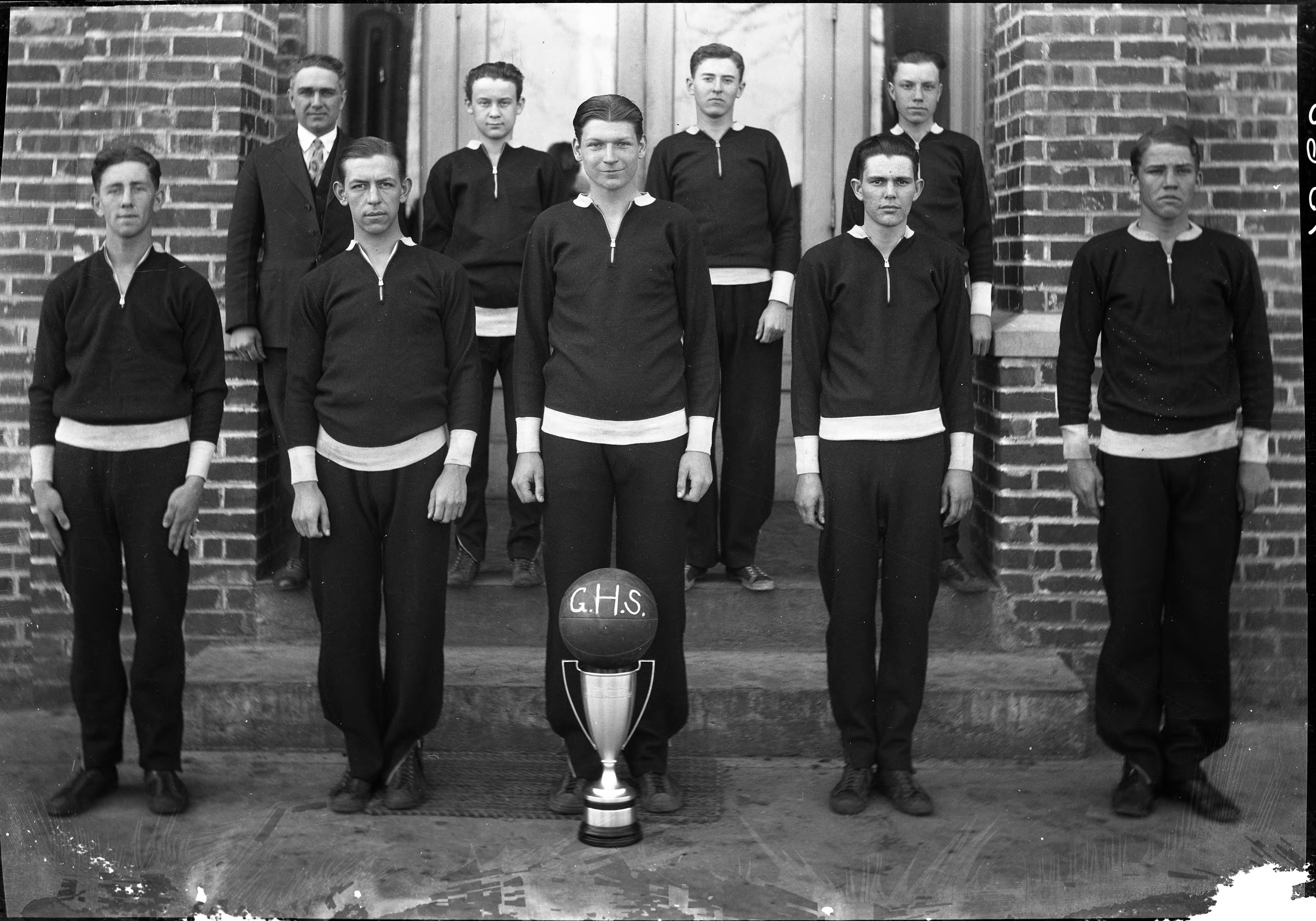 Griffin High School basketball team and coach, with championship trophy--probably posing outside of the school. A listing of Indiana state high school boys basketball championships back to 1910 does not show that they ever won state, so this may be a sectional or regional trophy.