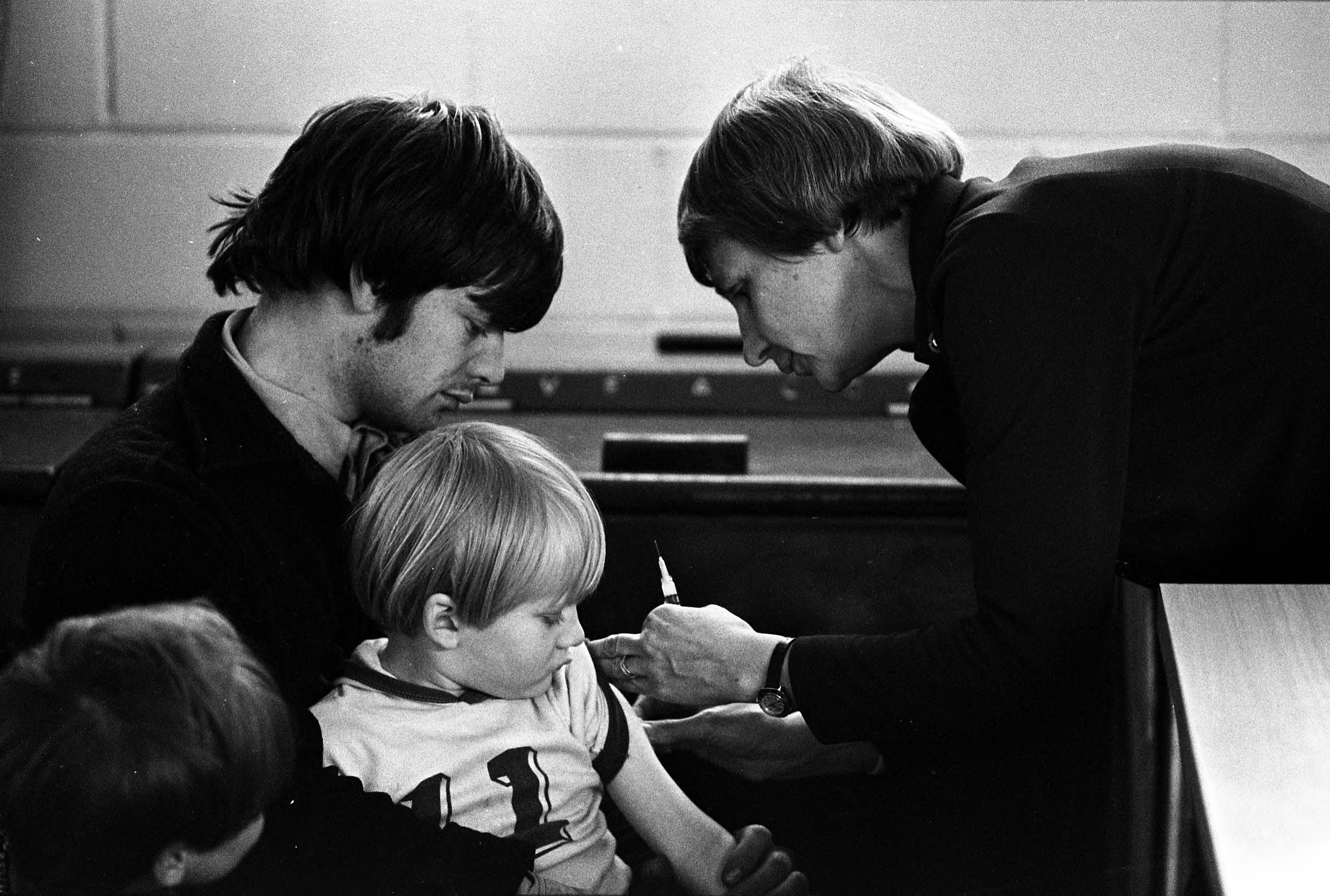 Father at health clinic with 2 young sons, both getting inoculations. As subsequent photographs prove, neither boy was happy about the experience.