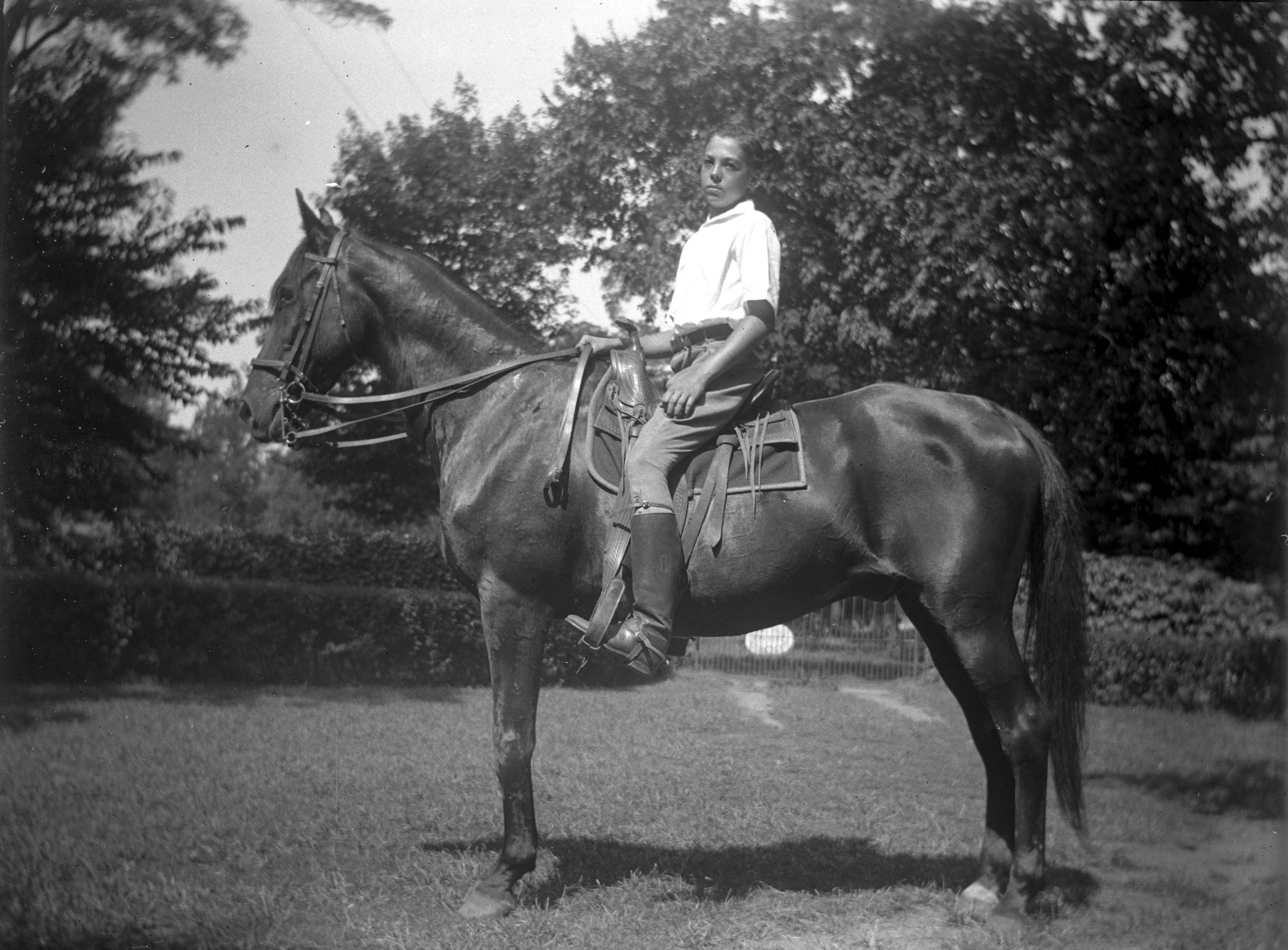 Elliott Hickam as a boy on a horse. They appear to be in a park or garden.