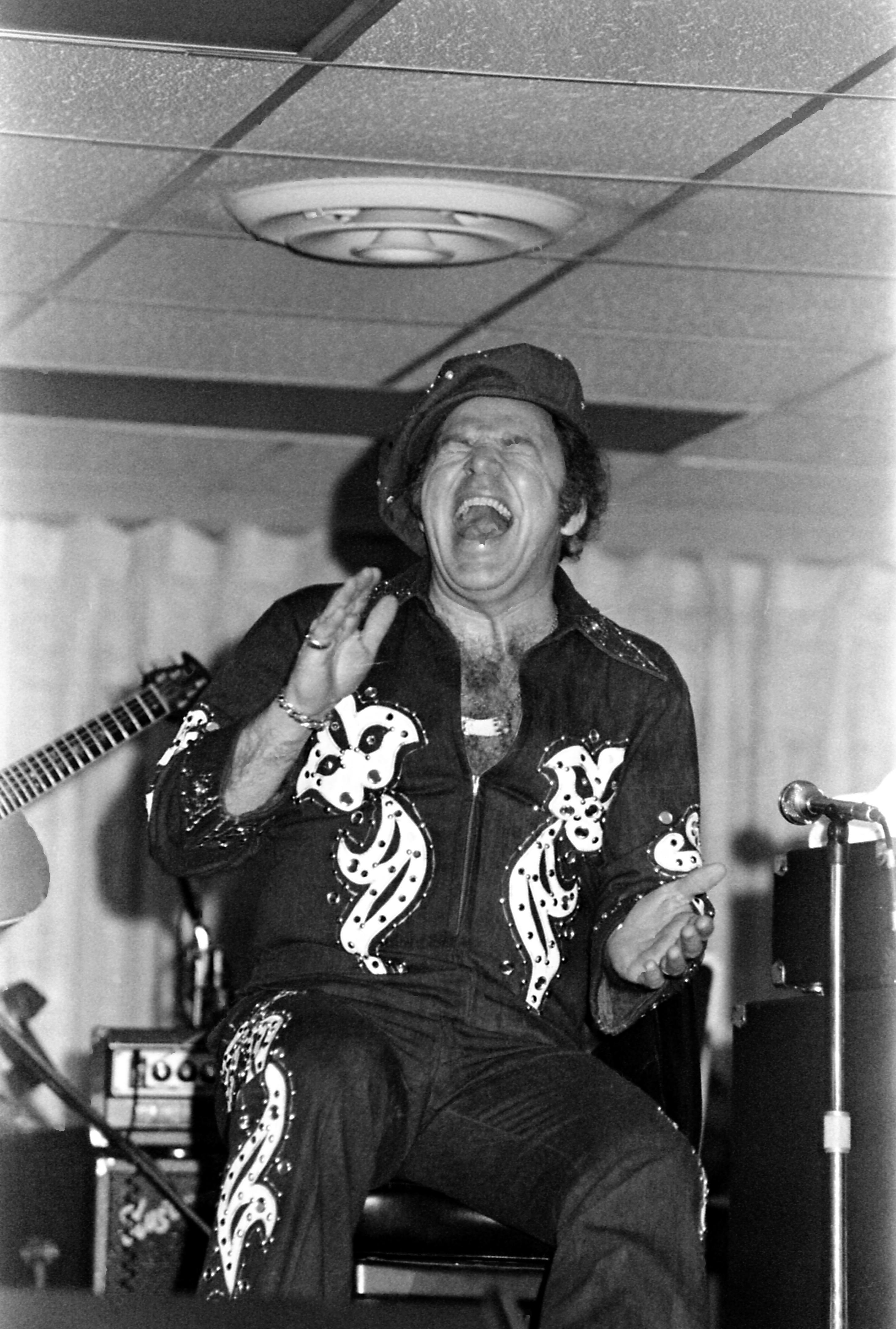 Roy Clark in concert, enjoying a big laugh. He played 3 nights at the Executive Inn (600 Walnut St."