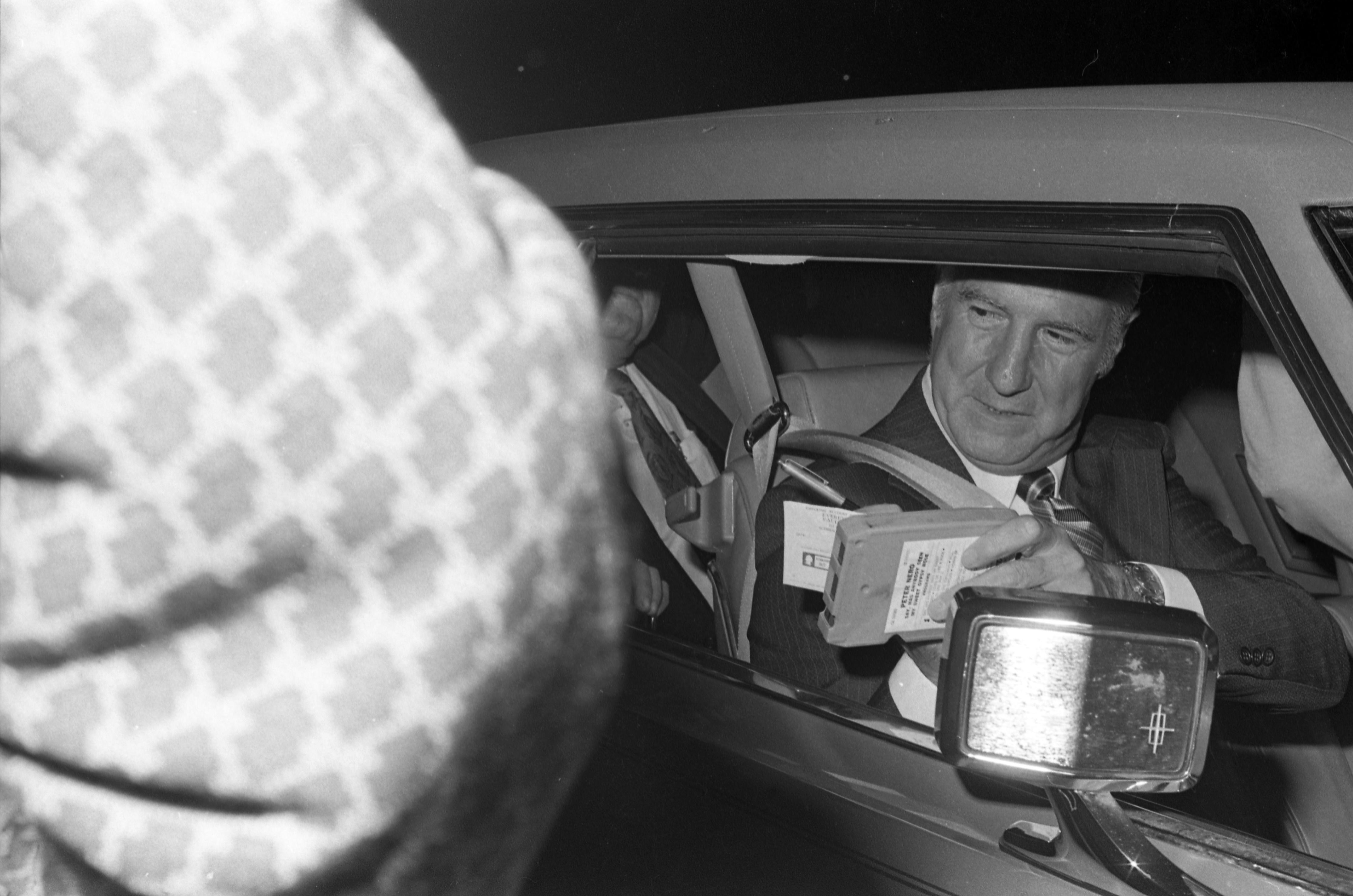 Former Vice President Spiro Agnew was in Evansville to discuss business deals with local businessman and land promoter, Walter Dilbeck, and to talk to bankers and attorneys. Here he is presumably signing an autograph for a young girl at Evansville Dress Regional Airport.