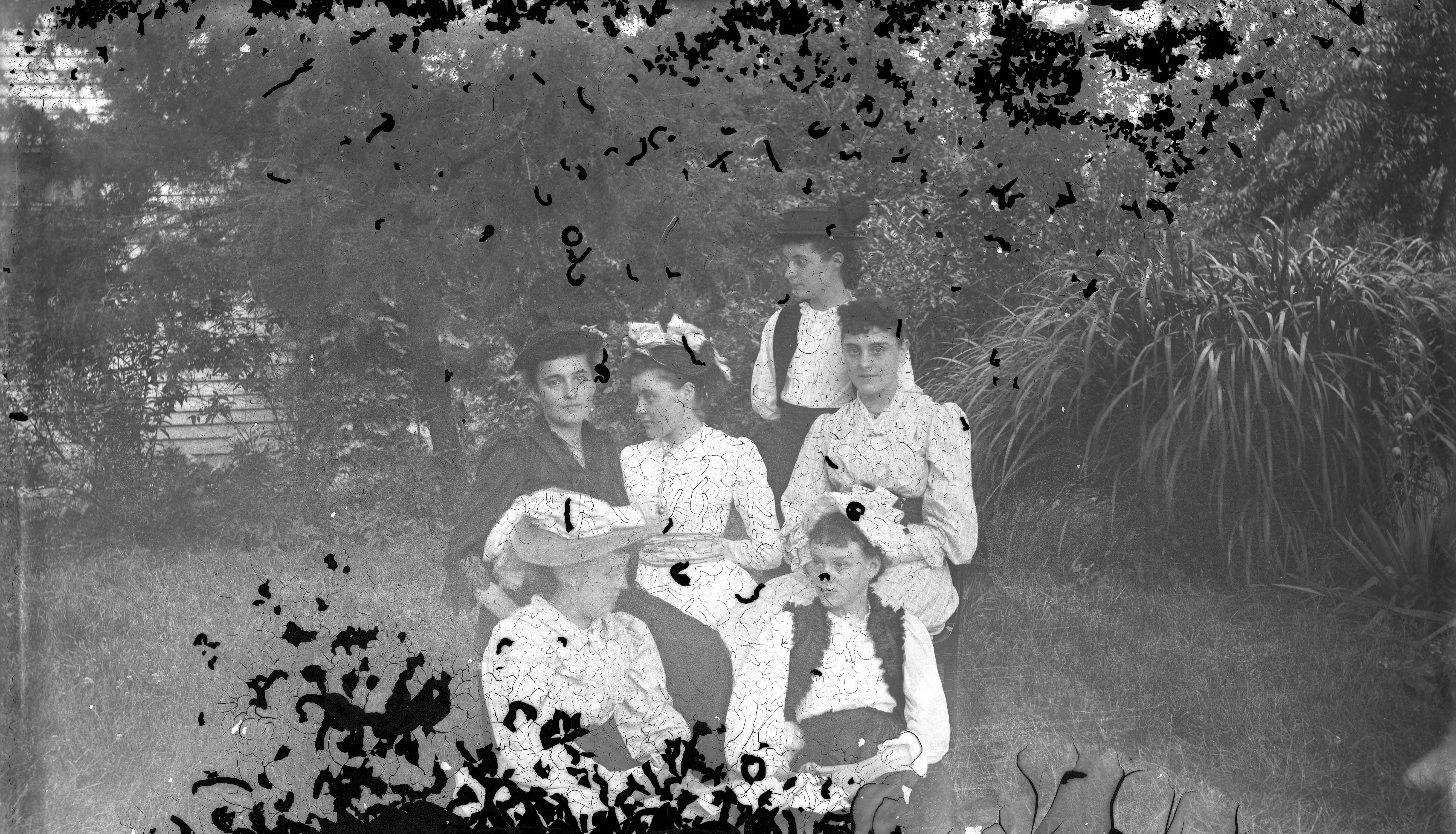 Six women in the yard of a house, with Kate Miller identified as 2nd row left (presumably with the black dress).