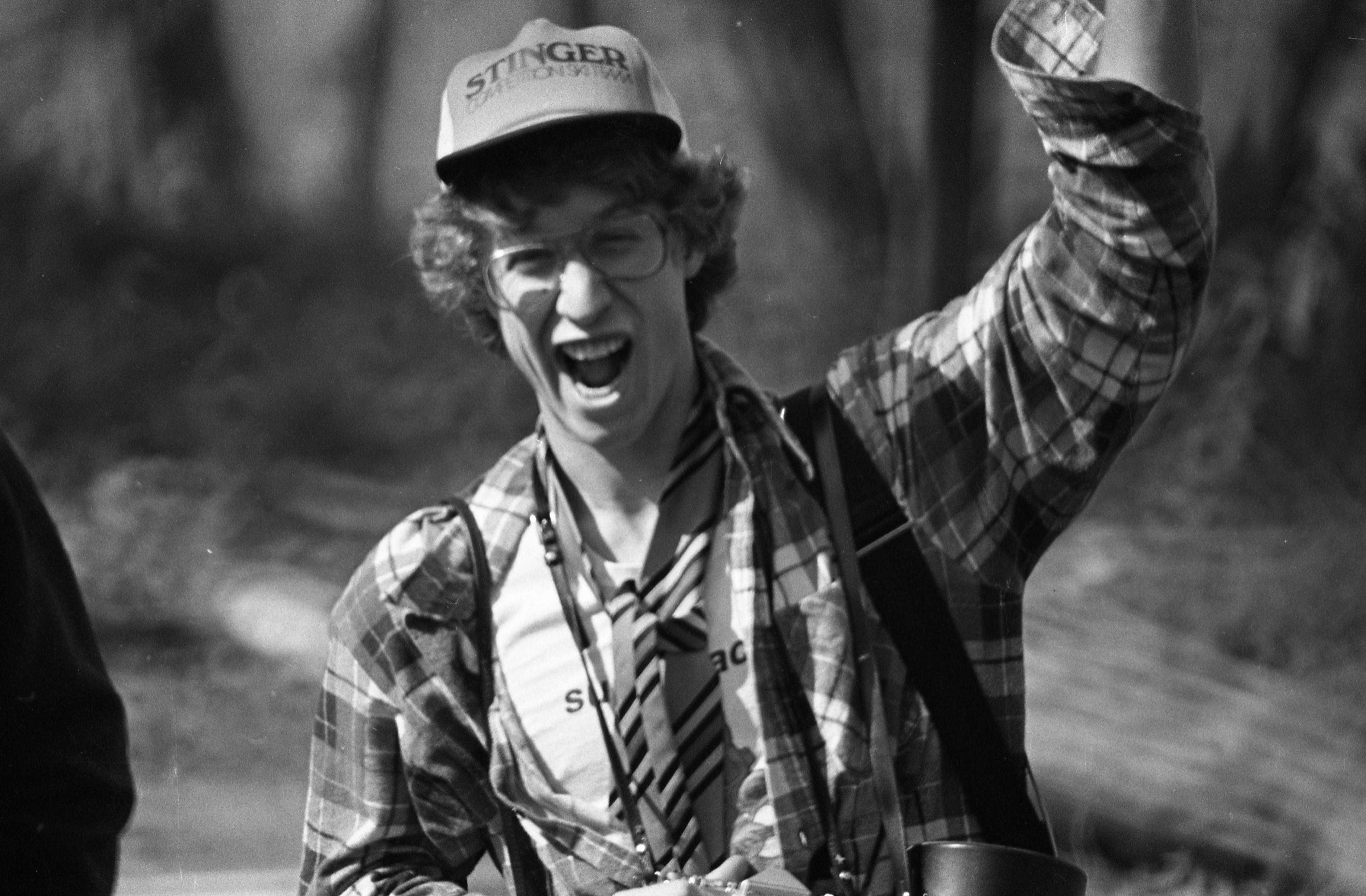 Unidentified young male photographer, with glasses, wearing a ball cap for Stinger Competition Ski Team