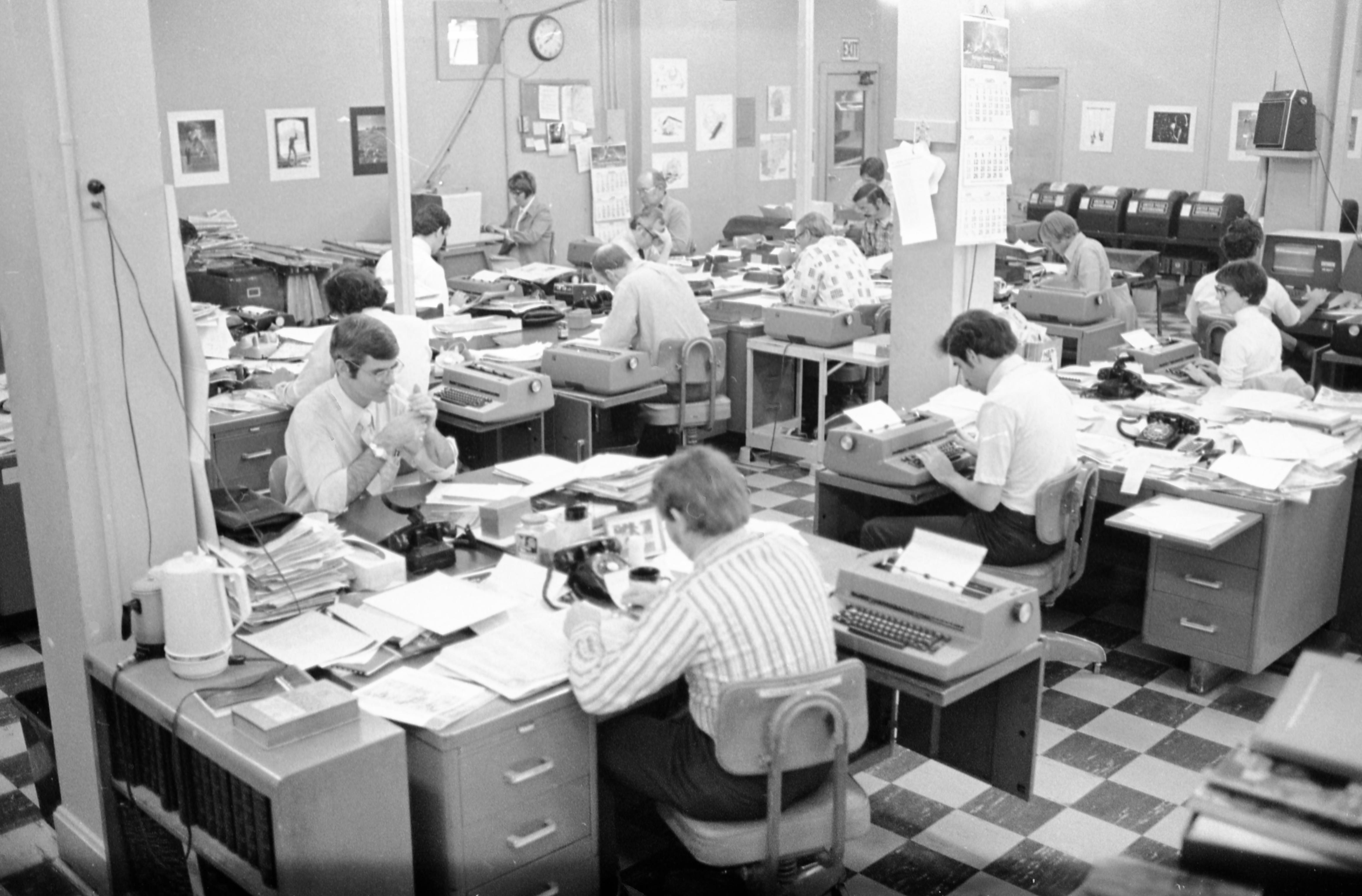 People working in the office of the Evansville Press at 201-07 NW 2nd St.